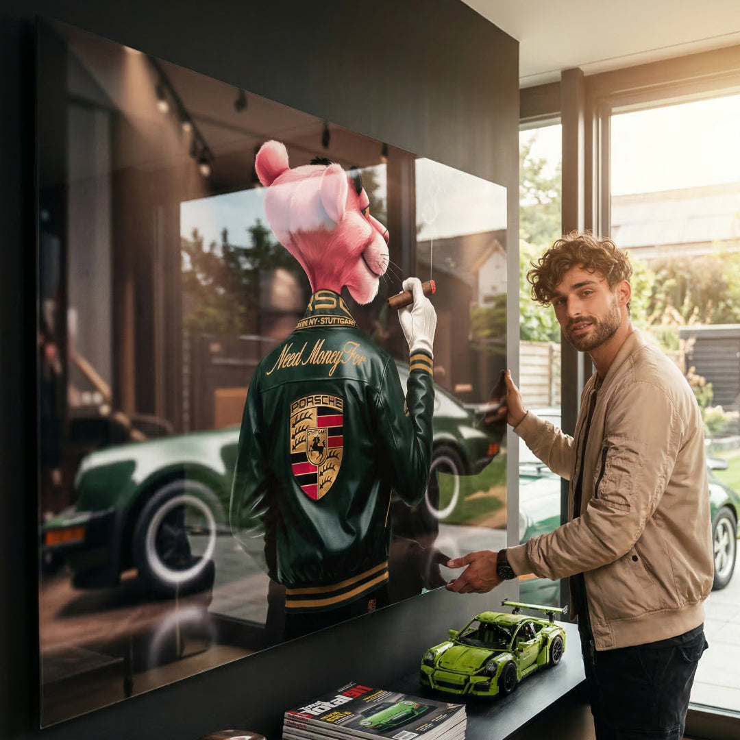 DOTCOMCANVAS® Premium Acrylglasbild mit Need Money for Porsche 2.0 Motiv.