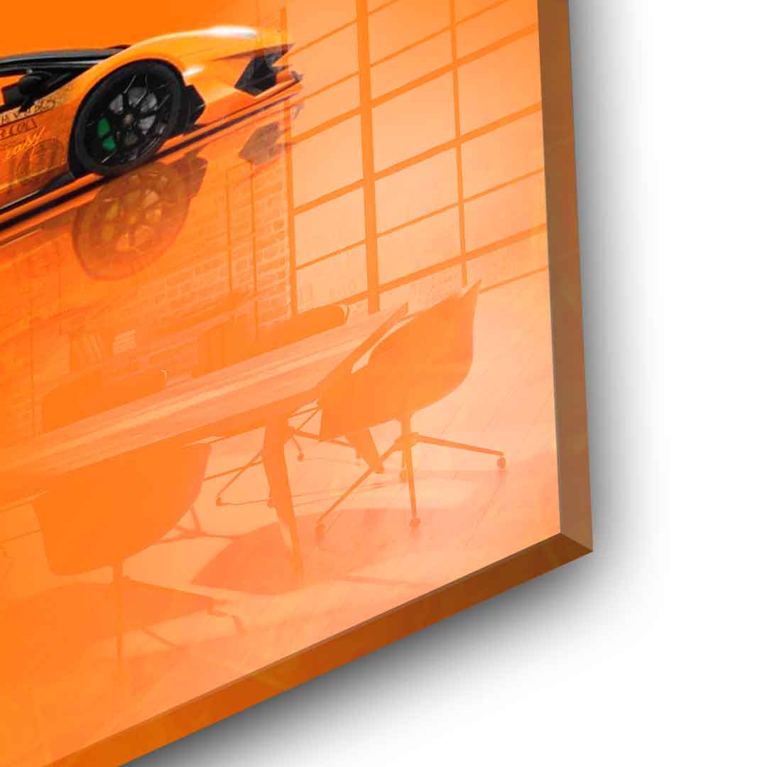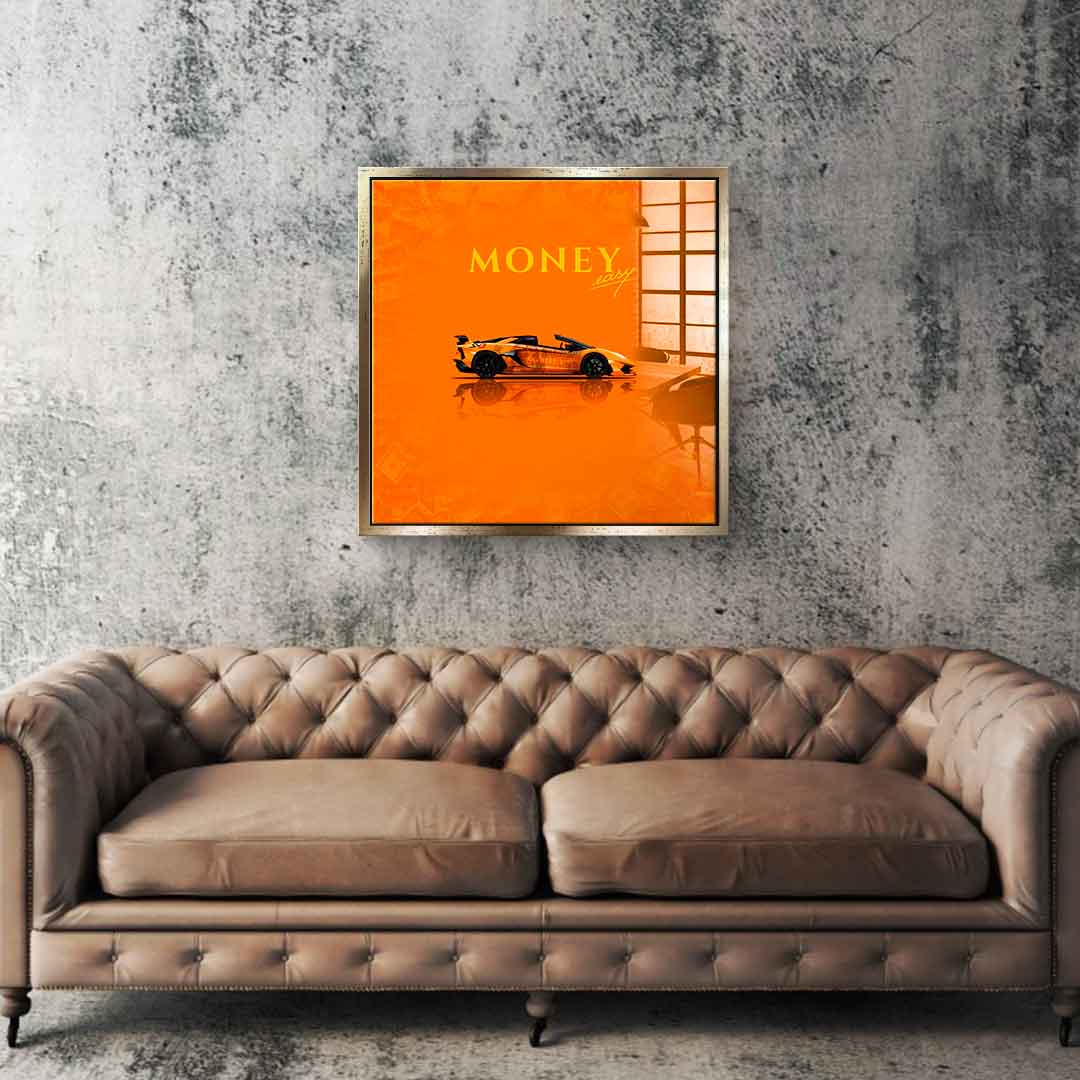 DOTCOMCANVAS® Premium Acrylglasbild mit gelben/orangenem Lamborghini Aventador und Schriftzug Money easy - Motiv.
