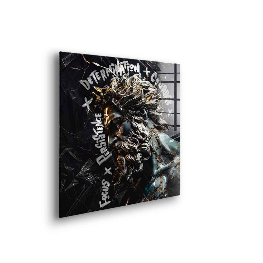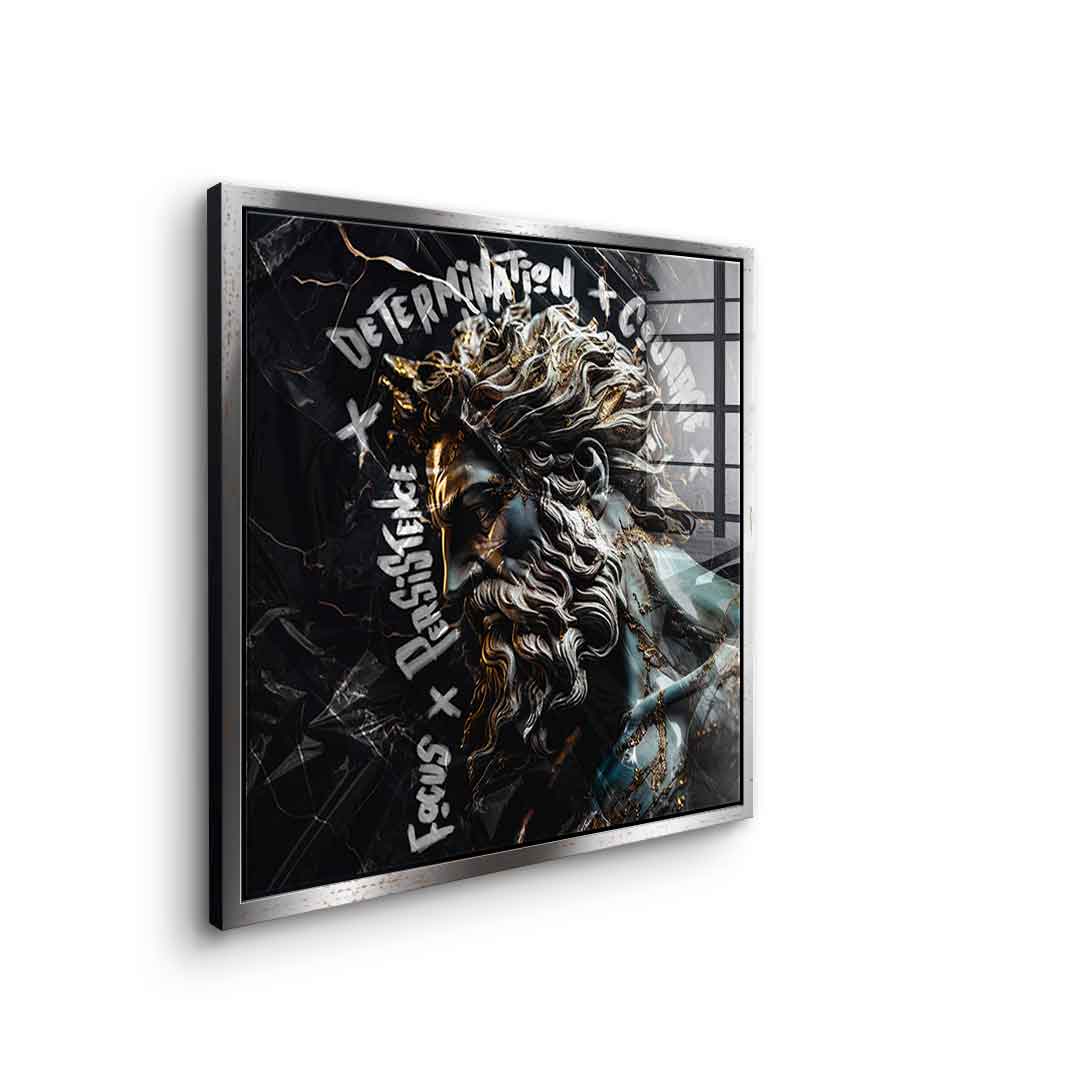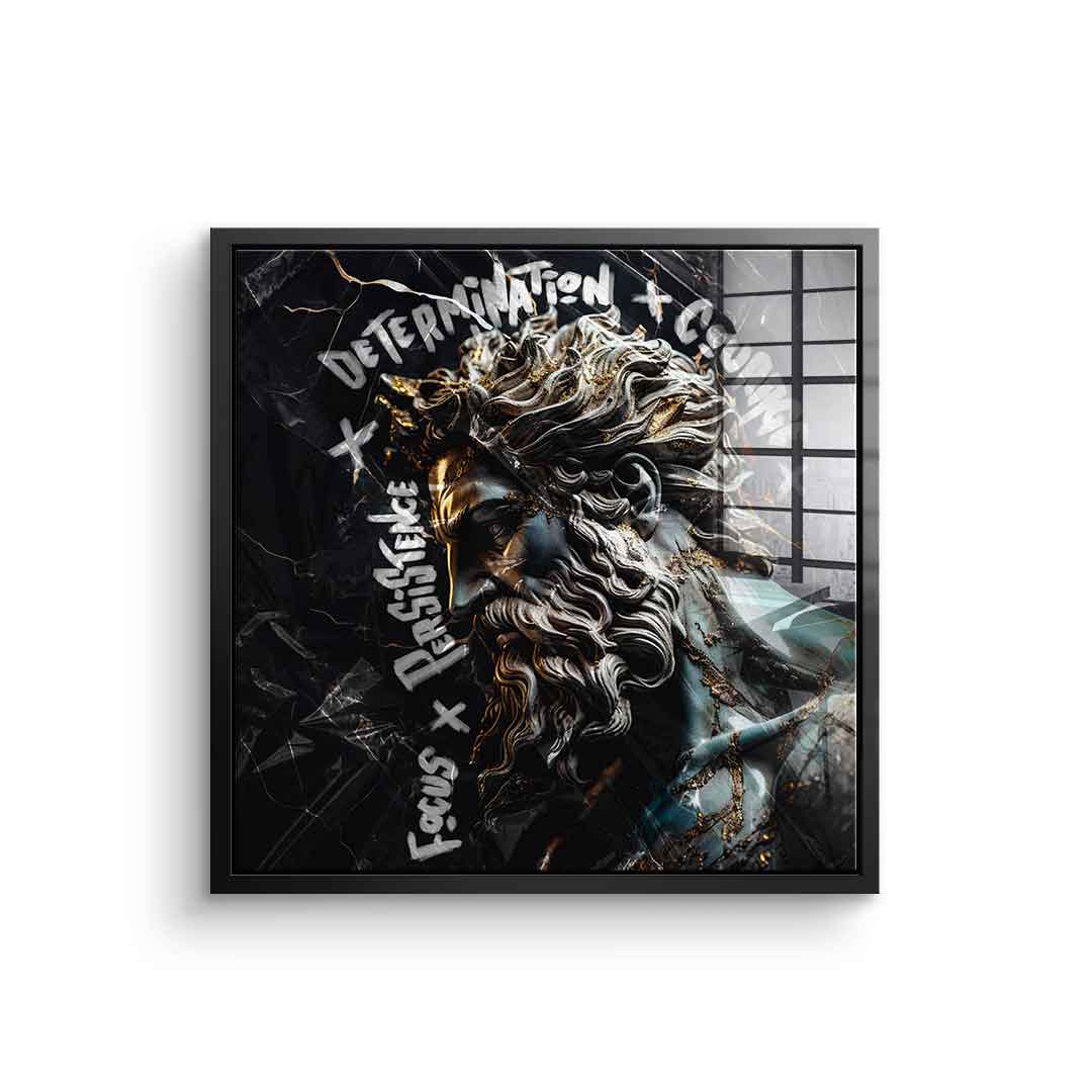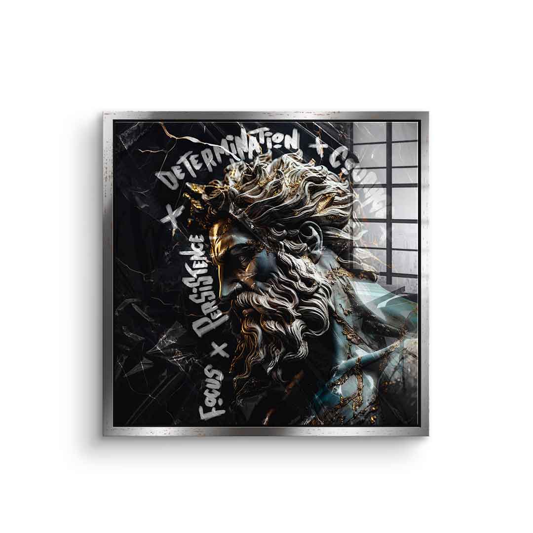 DOTCOMCANVAS® Premium Acrylglasbild mit Zeus - Motiv und motivierenden Wörtern.