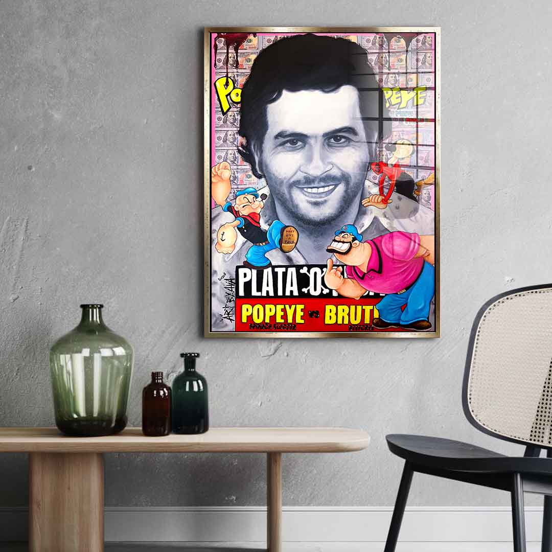 DOTCOMCANVAS® Premium Acrylglasbild mit Pablo Escobar - Motiv zusammen mit Popeye vs Brutus im Comic / Cartoon Stil.