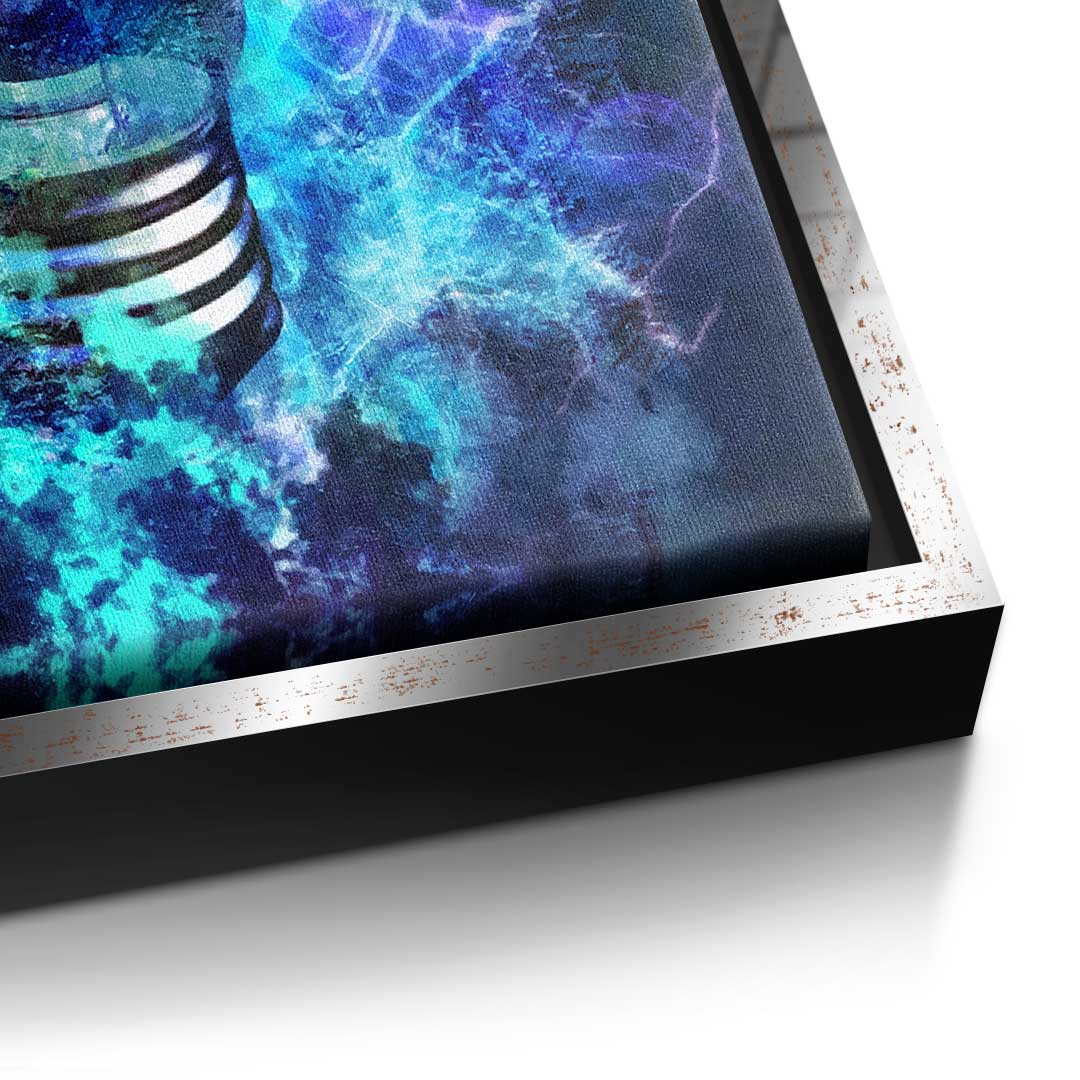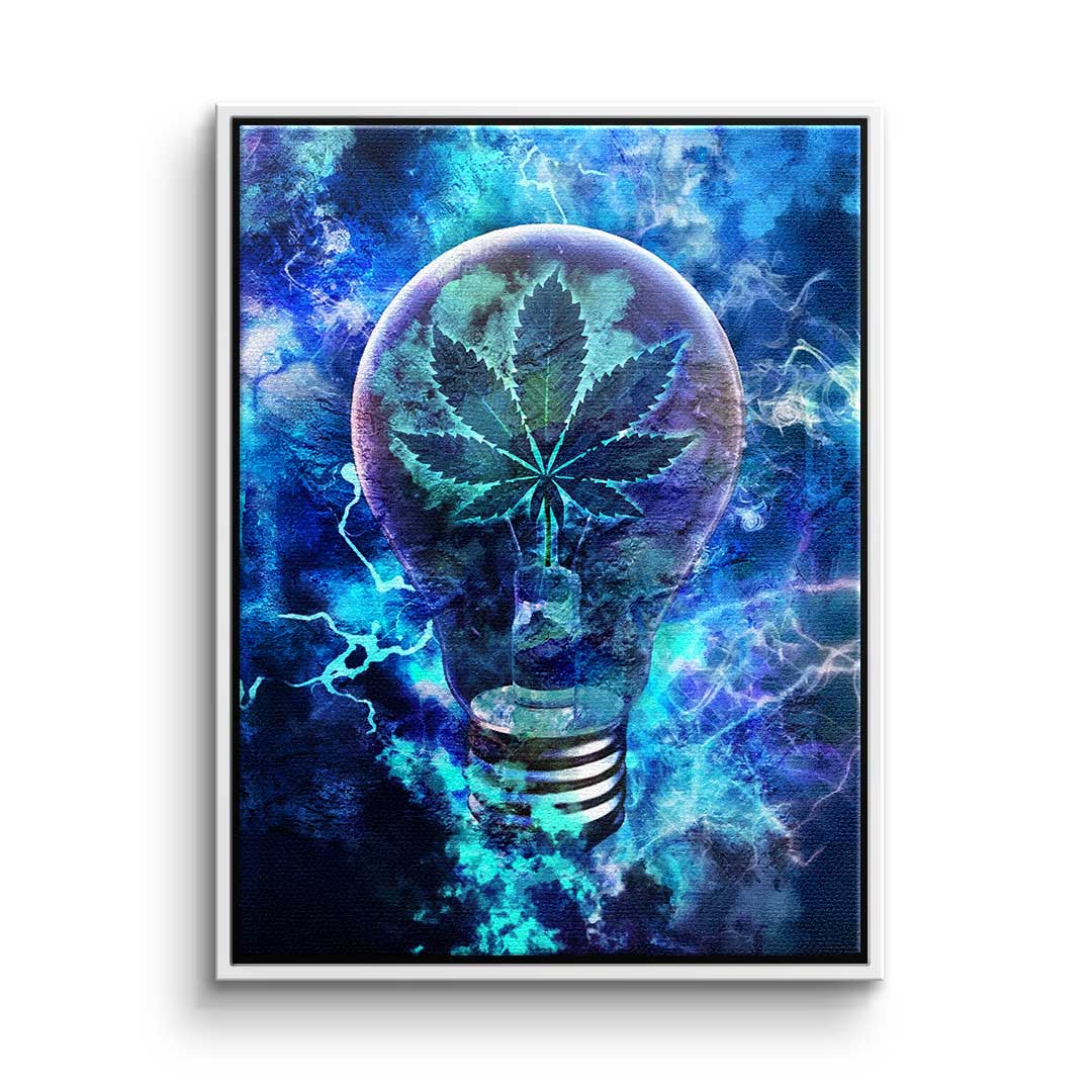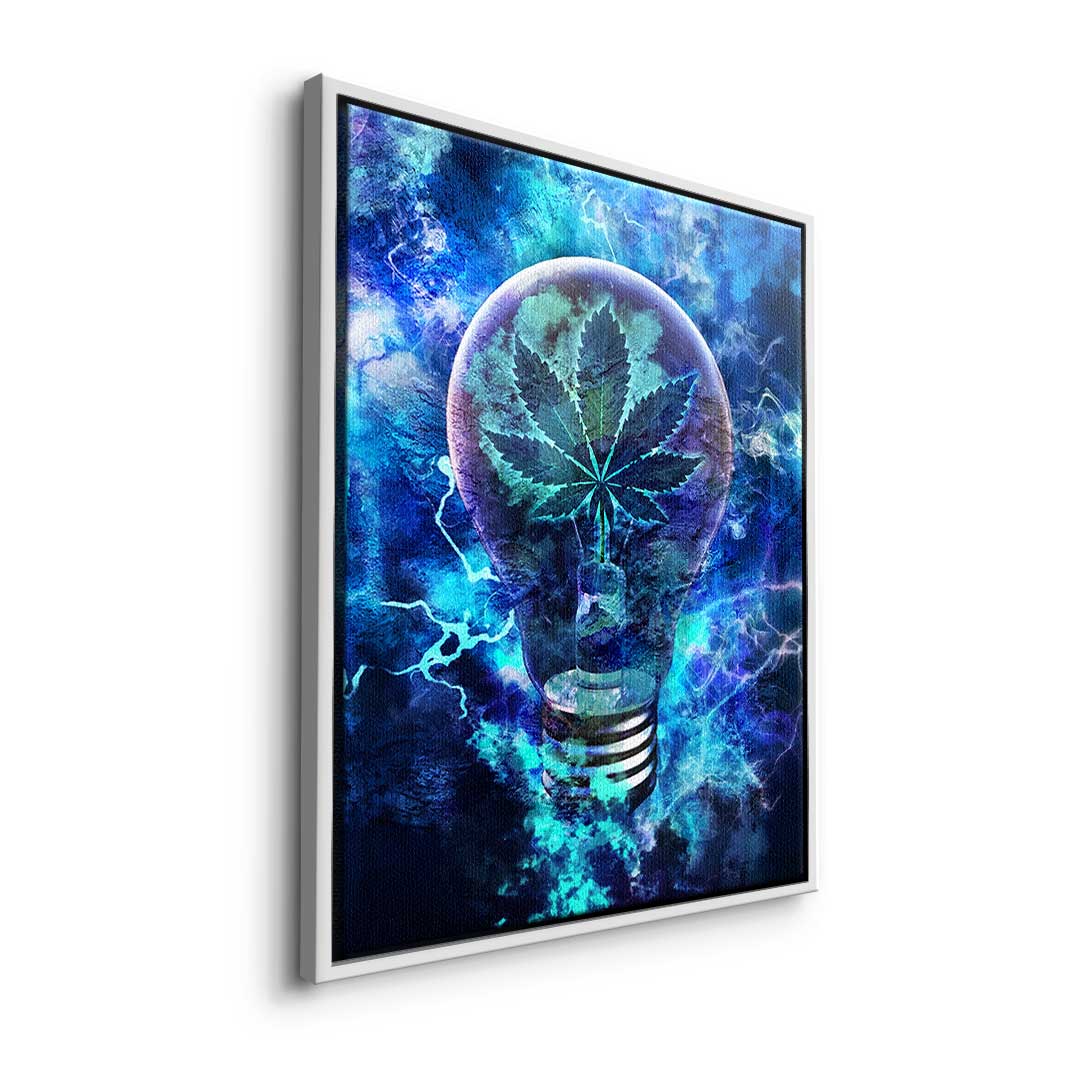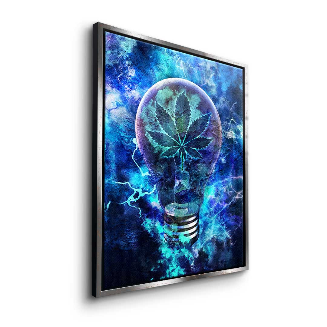 DOTCOMCANVAS®Premium Leinwandbild im Pop Art Stil mit Glühbirne und Weed-Blättern in Blau, Schwarz und Silber.