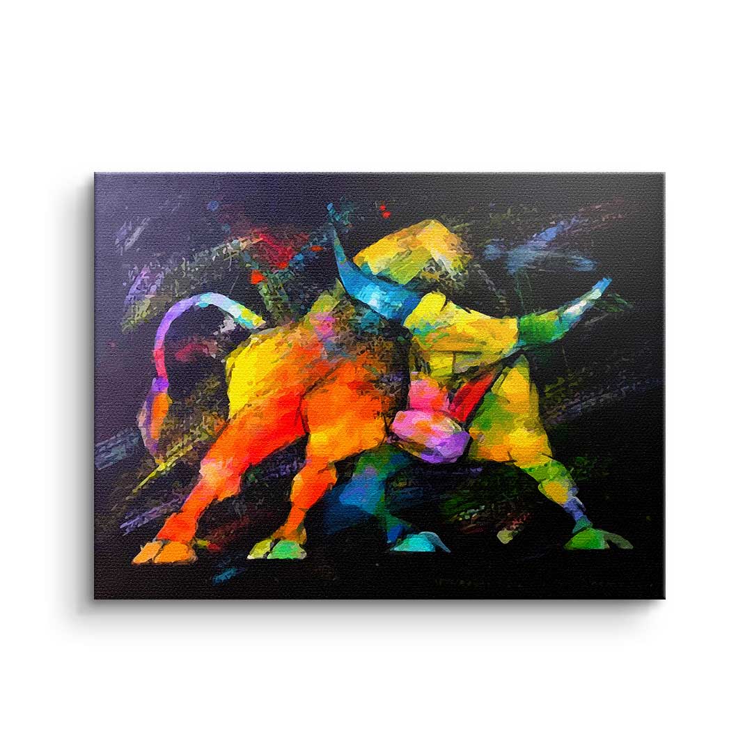 DOTCOMCANVAS®Premium Leinwandbild im Pop Art Stil mit wildem Bulle in bunten Farben.