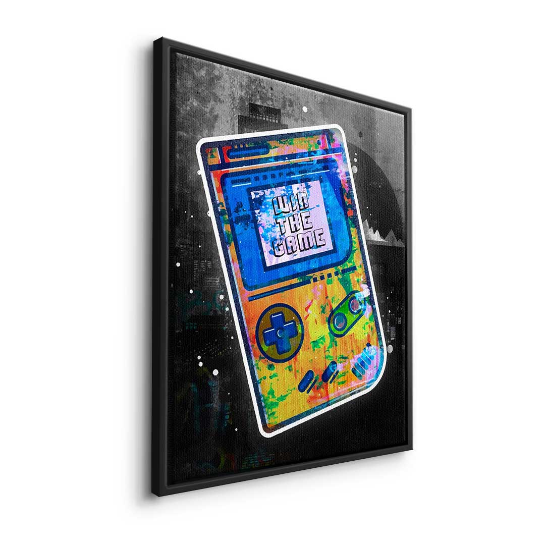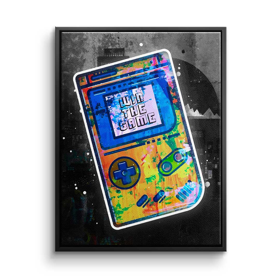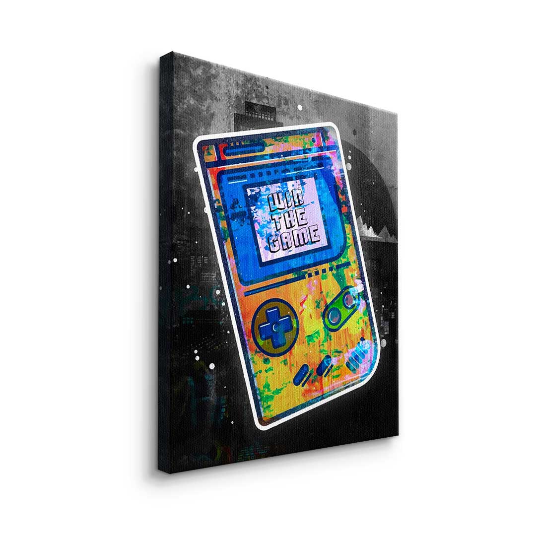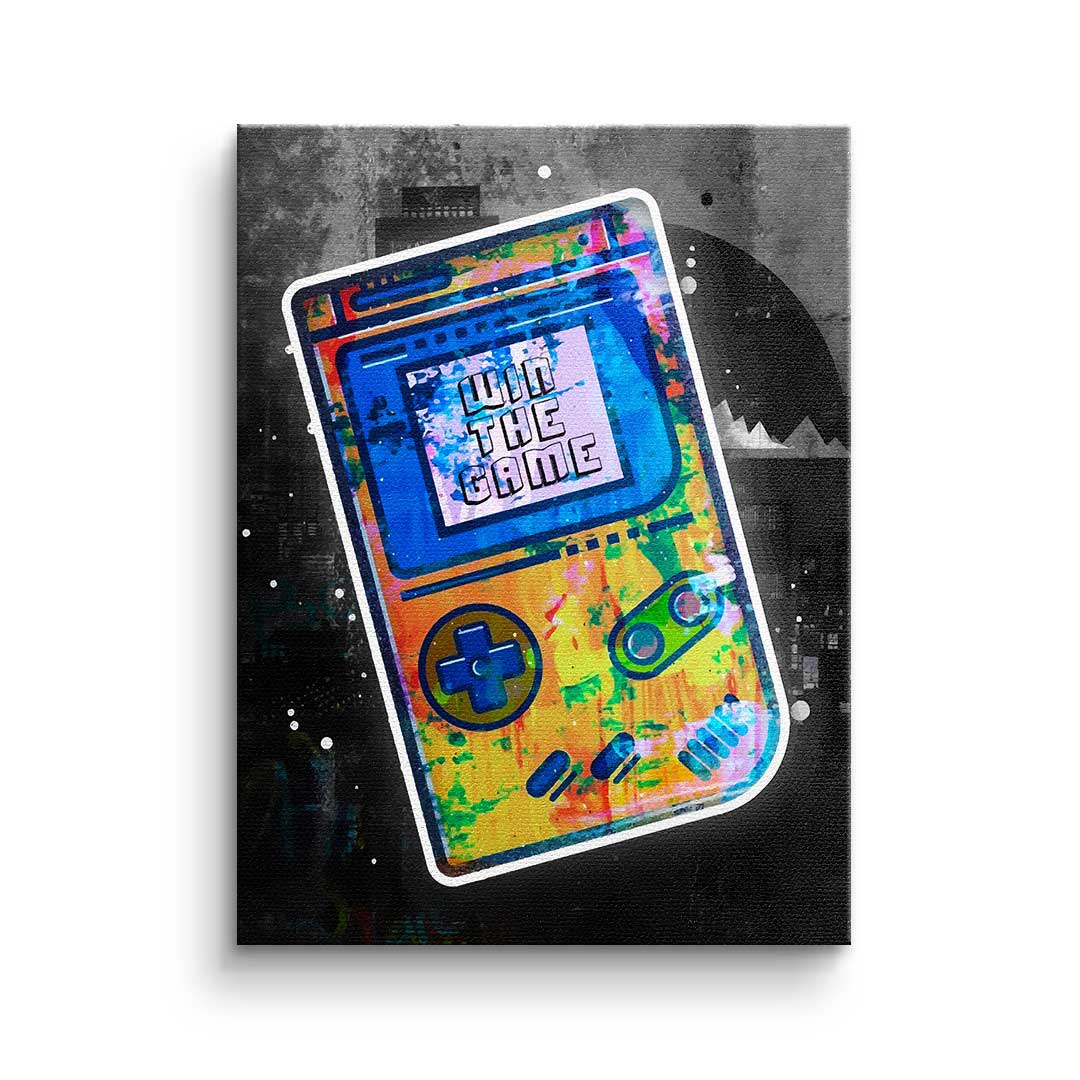 DOTCOMCANVAS® Premium Leinwandbild im Pop Art Stil mit buntem Gameboy-Motiv und Motivationsspruch.