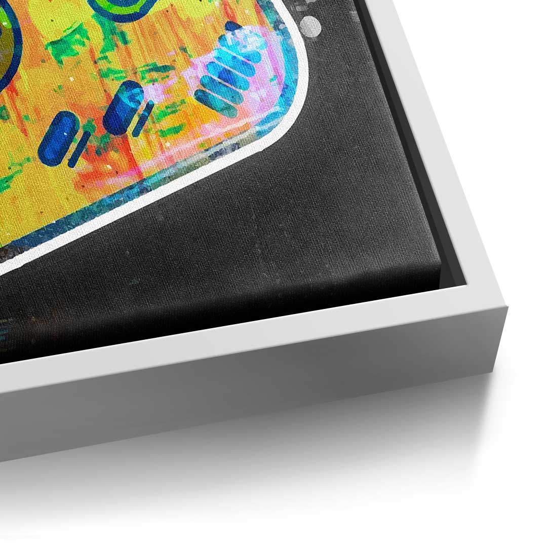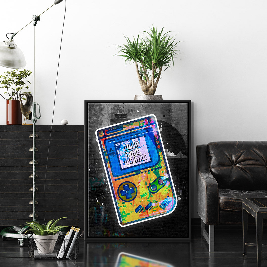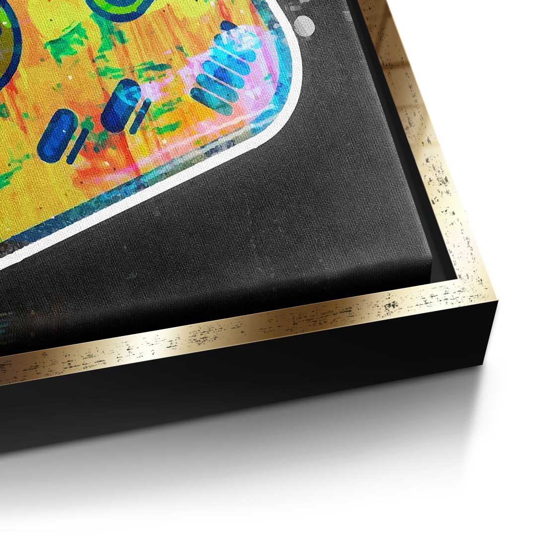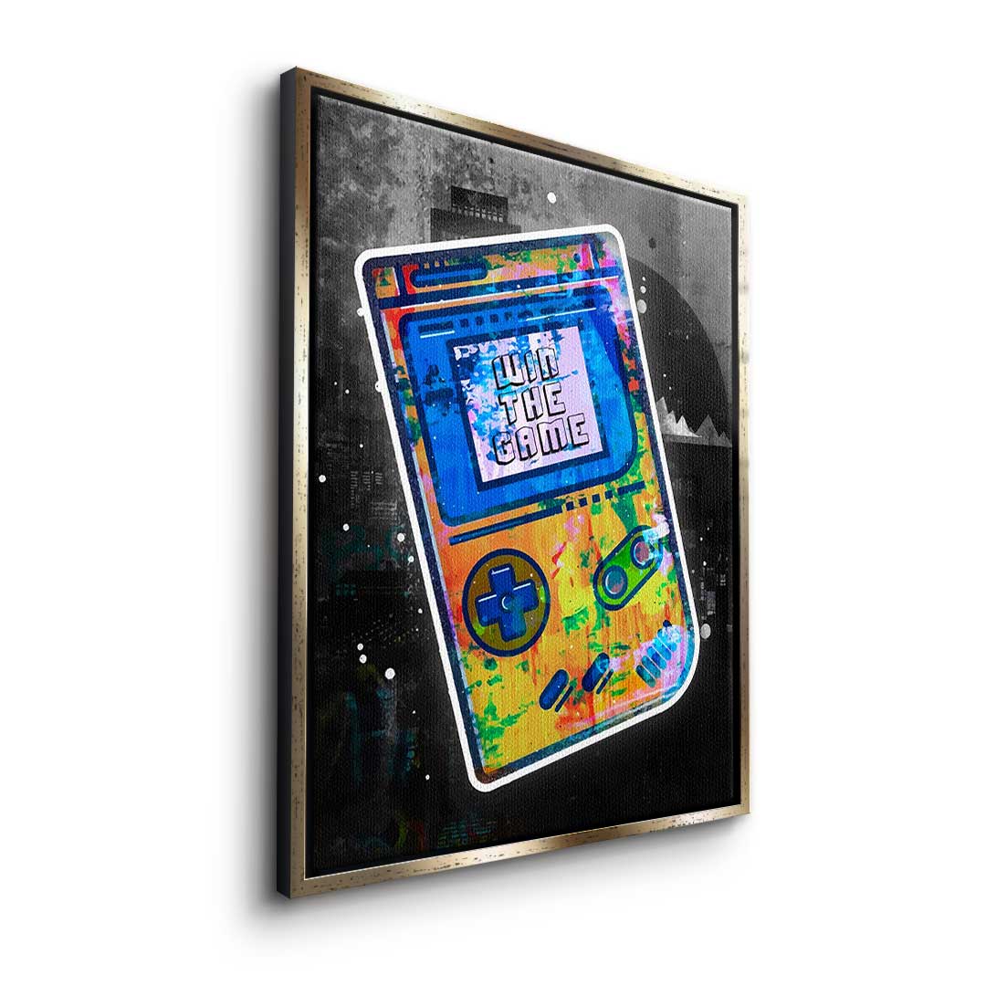 DOTCOMCANVAS® Premium Leinwandbild im Pop Art Stil mit buntem Gameboy-Motiv und Motivationsspruch.
