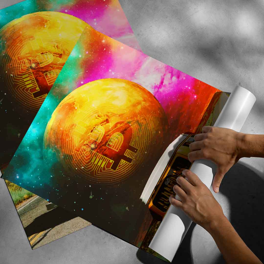 DOTCOMCANVAS® Premium Poster mit Bitcoin Roadtrip Motiv.