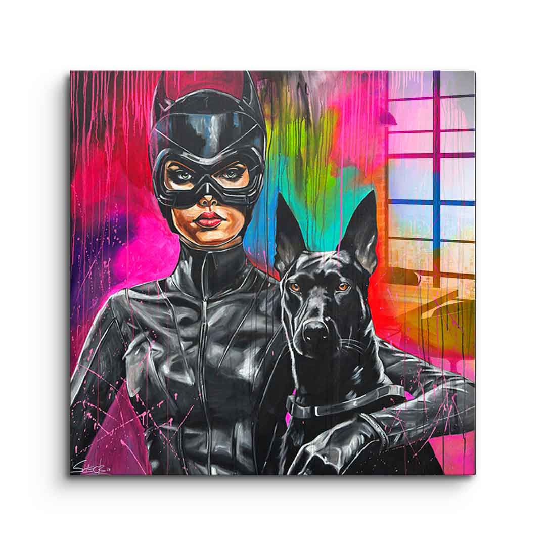 DOTCOMCANVAS® Premium Acrylglasbild mit Catwoman und Dobermann Motiv im Gemälde - Stil.