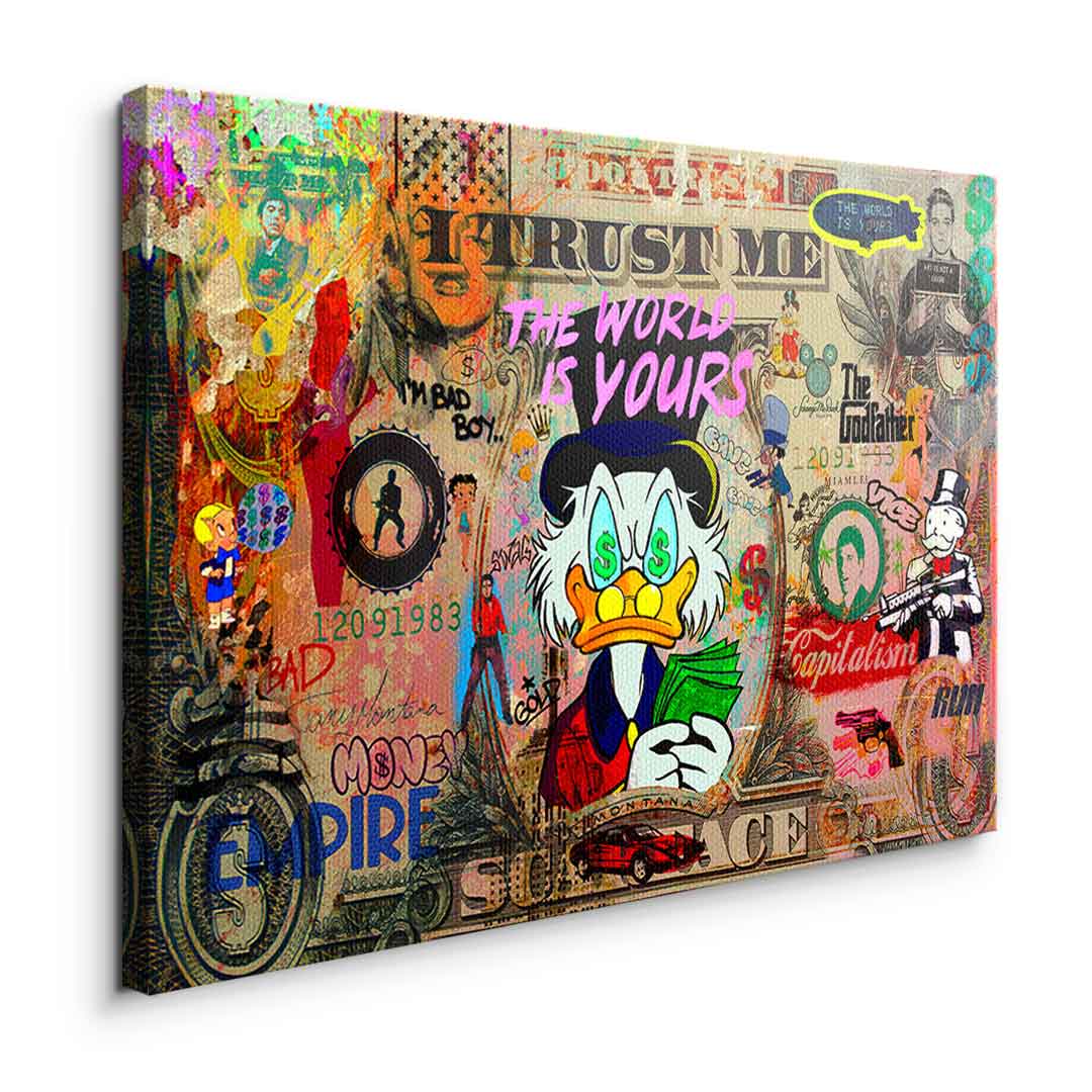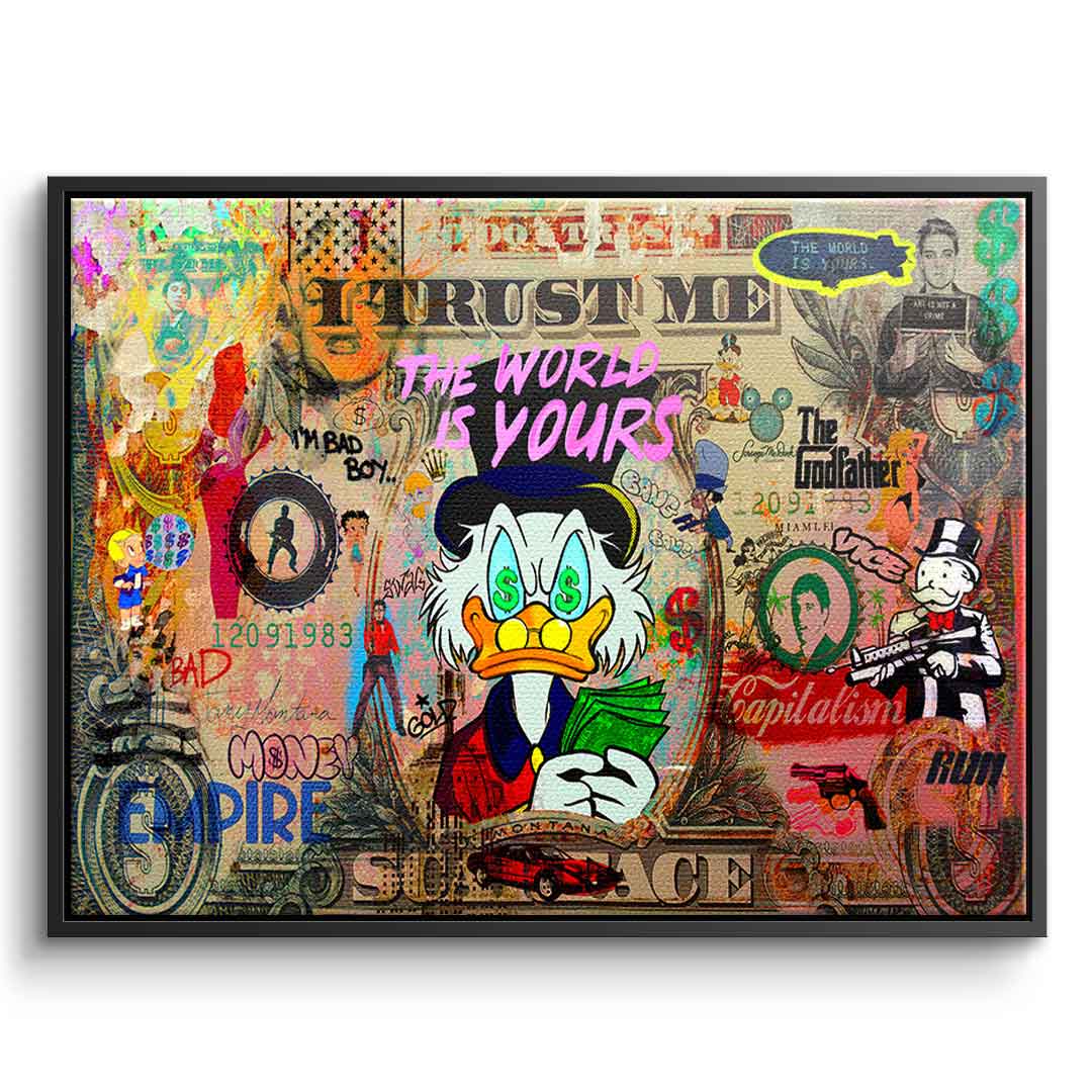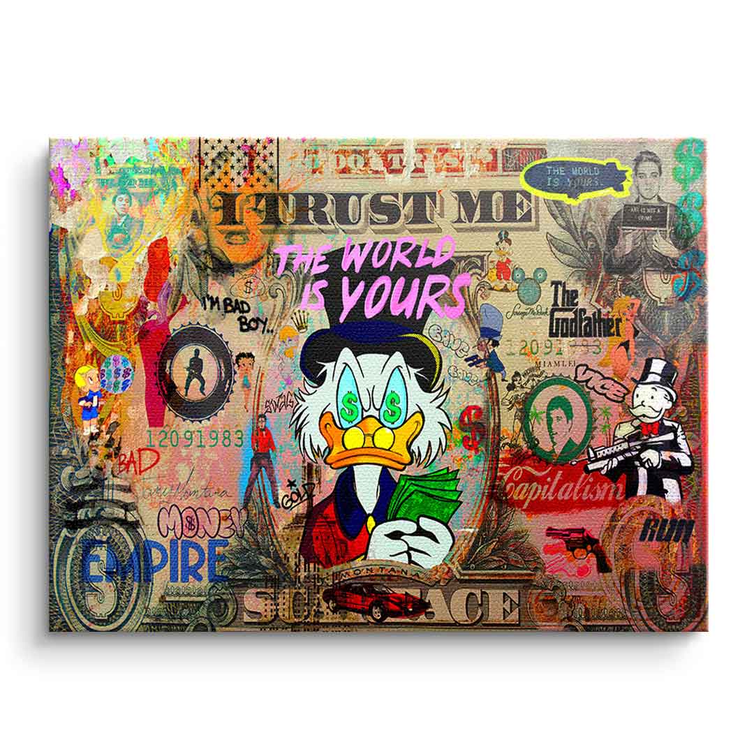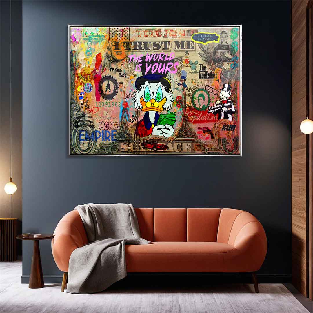 DOTCOMCANVAS® Premium Leinwandbild mit SCROOGE LIFE IS INSANE Motiv im Pop Art Stil.
