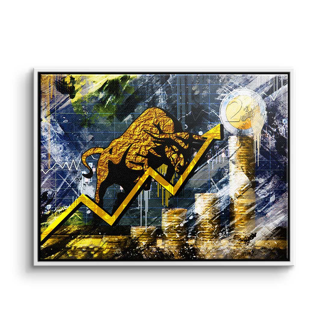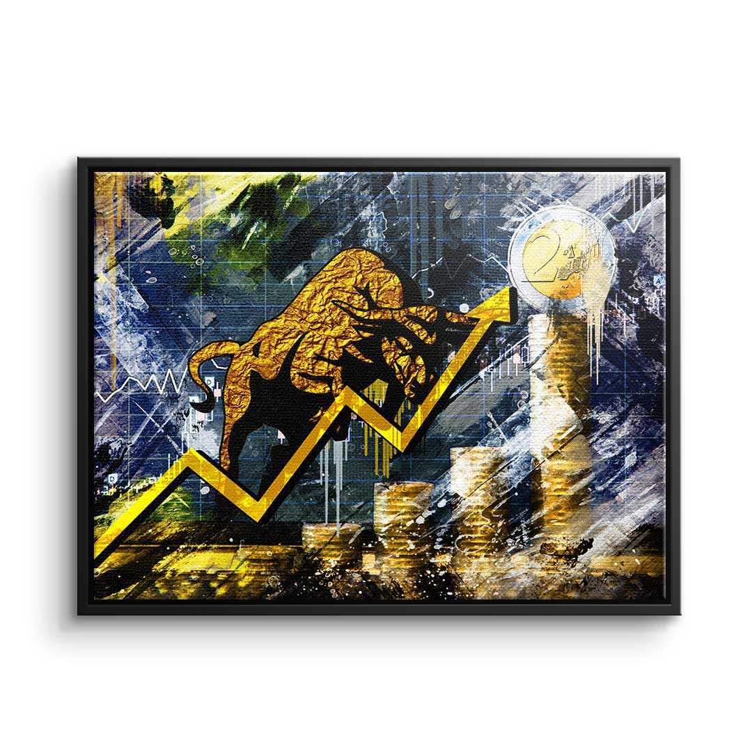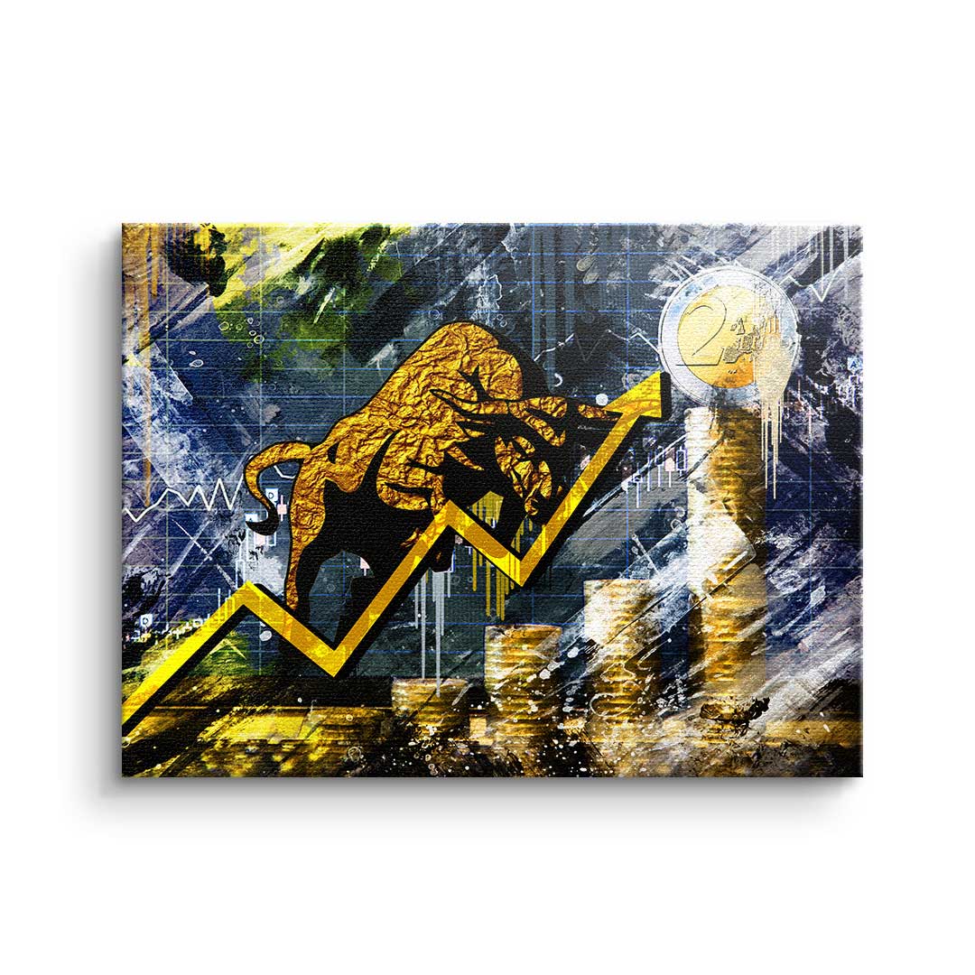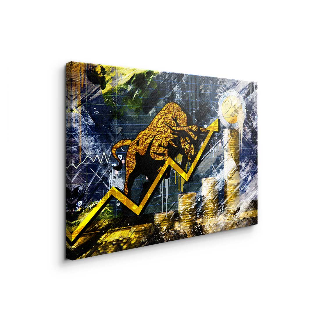 DOTCOMCANVAS® Premium Leinwandbild mit Bullen und Graphen im Pop Art Stil in Gold und Blau.