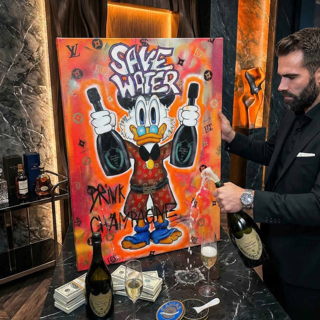 DOTCOMCANVAS® Premium Duck Pop Art Comic Leinwandbild Save Water Drink Champagne Motiv mit Premium Rahmen.