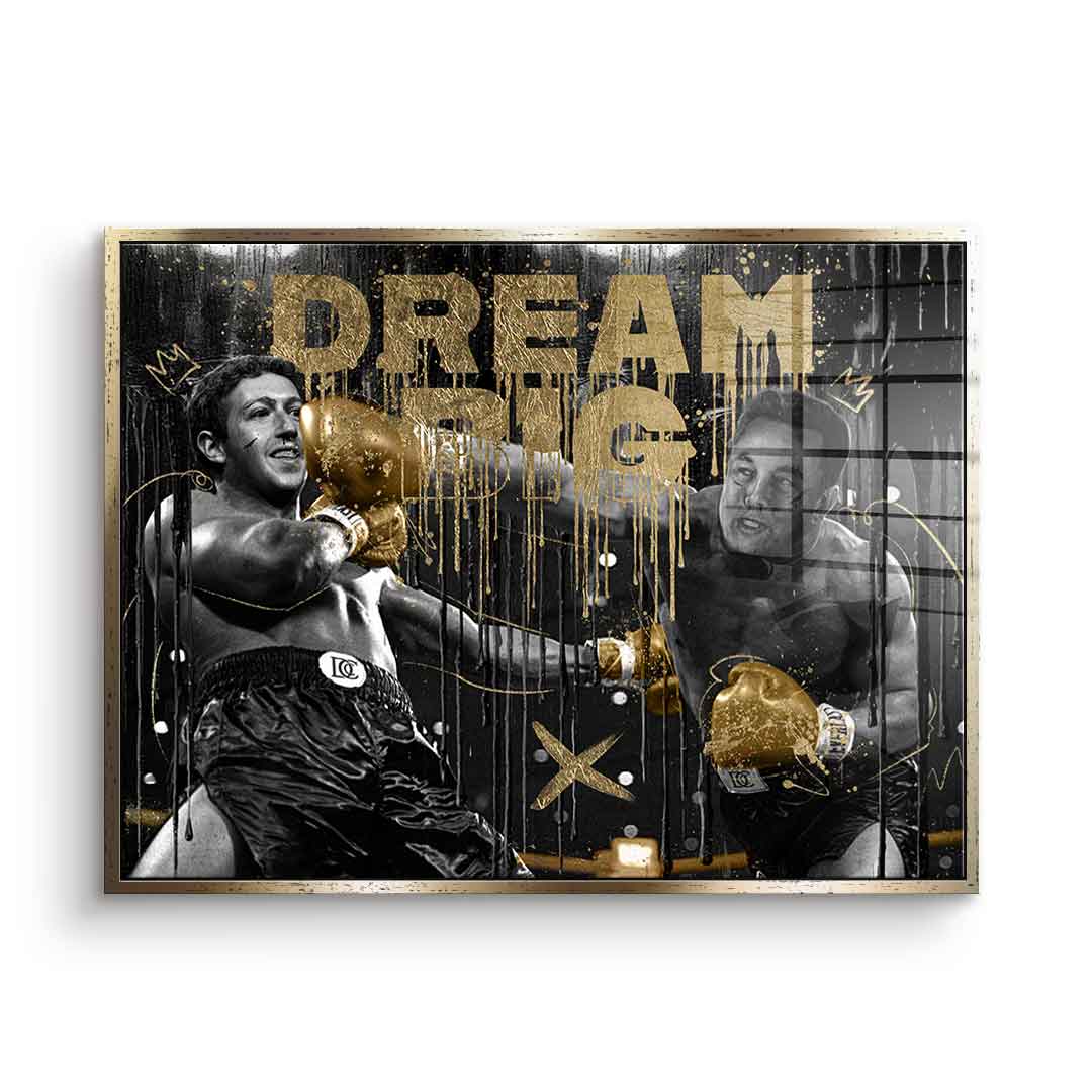 DOTCOMCANVAS® Premium Leinwandbild mit Mark Zuckerberg vs. Elon Musk - Motiv mit Schriftzug "Dream big".