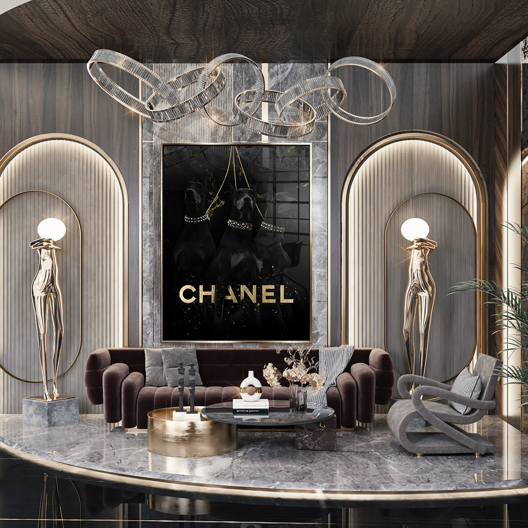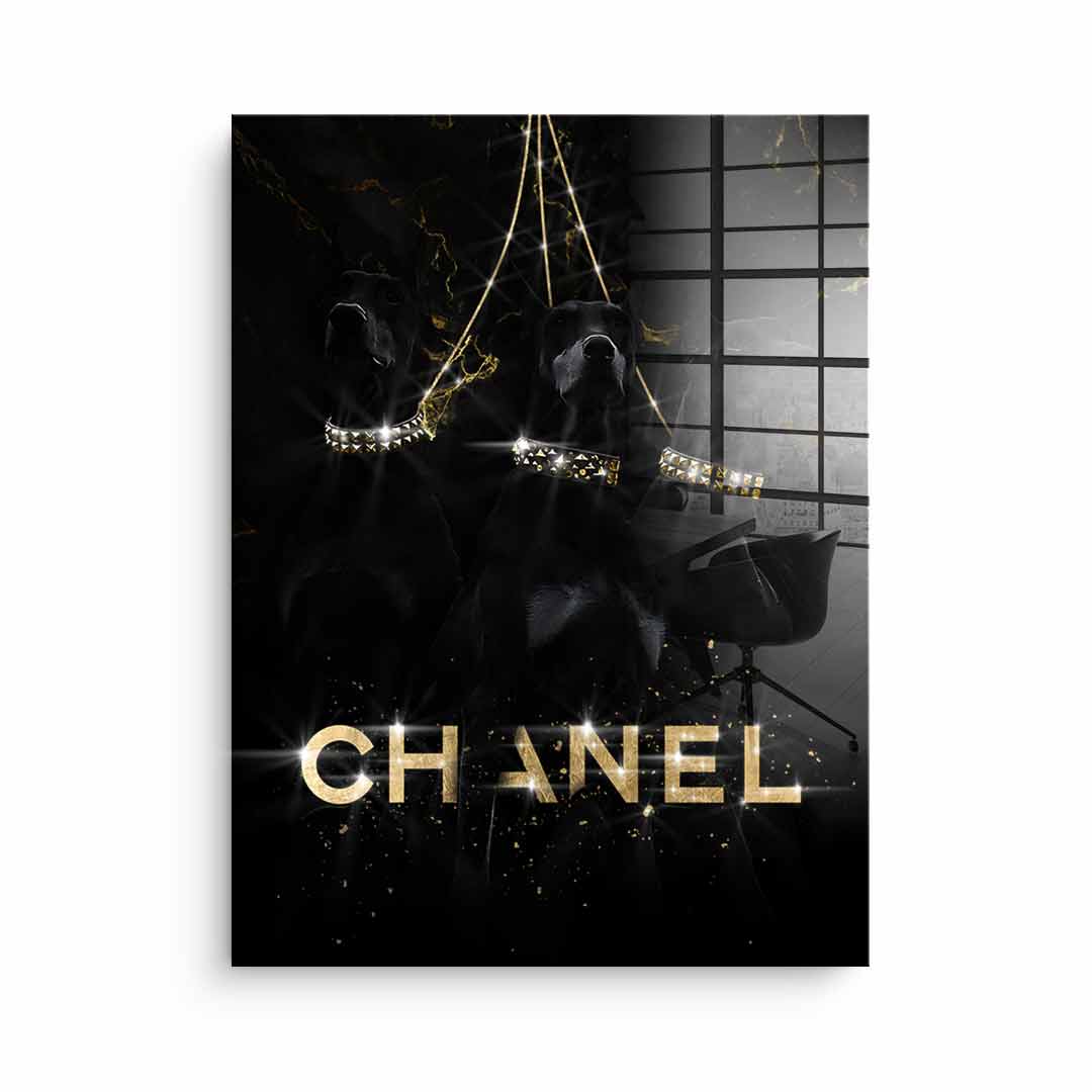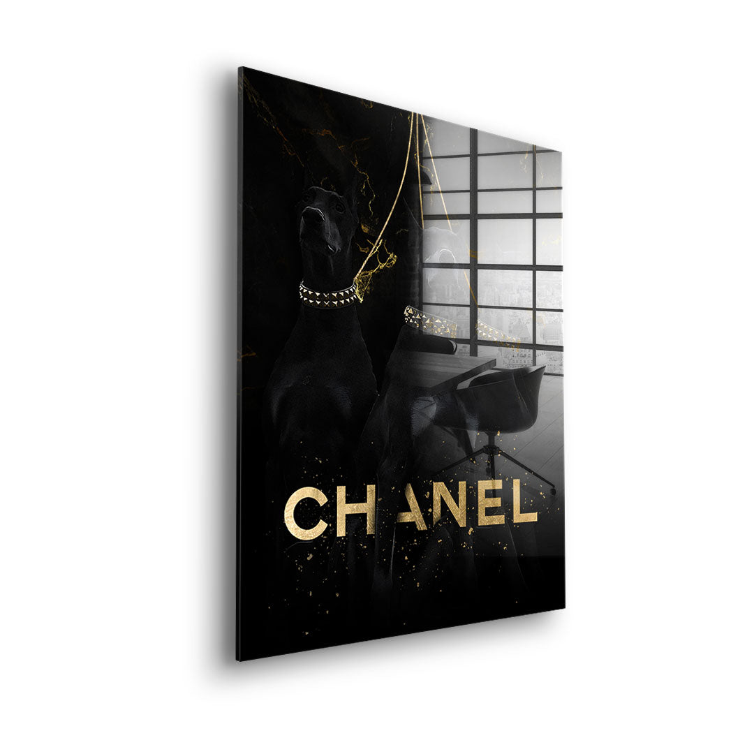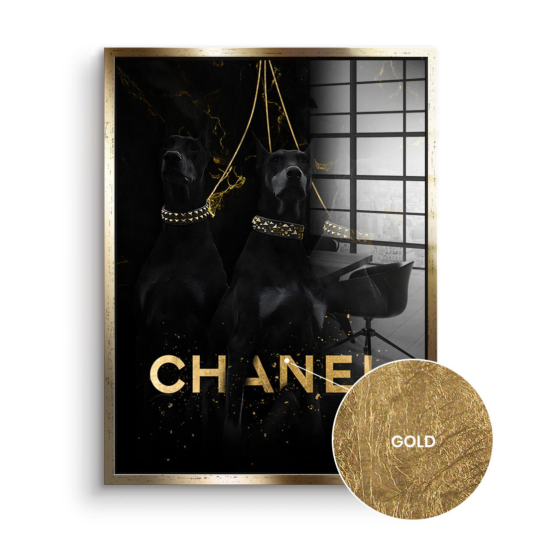 DOTCOMCANVAS® Premium Acrylglasbild im mit drei Dobermann Hunden in mayestetischen Anblitz.