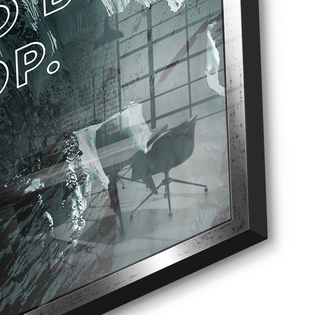 DOTCOMCANVAS® Premium Acrylglasbild mit Bergen und dem Motivationsspruch "Nobody knows how much you had to climb to be at the Top."
