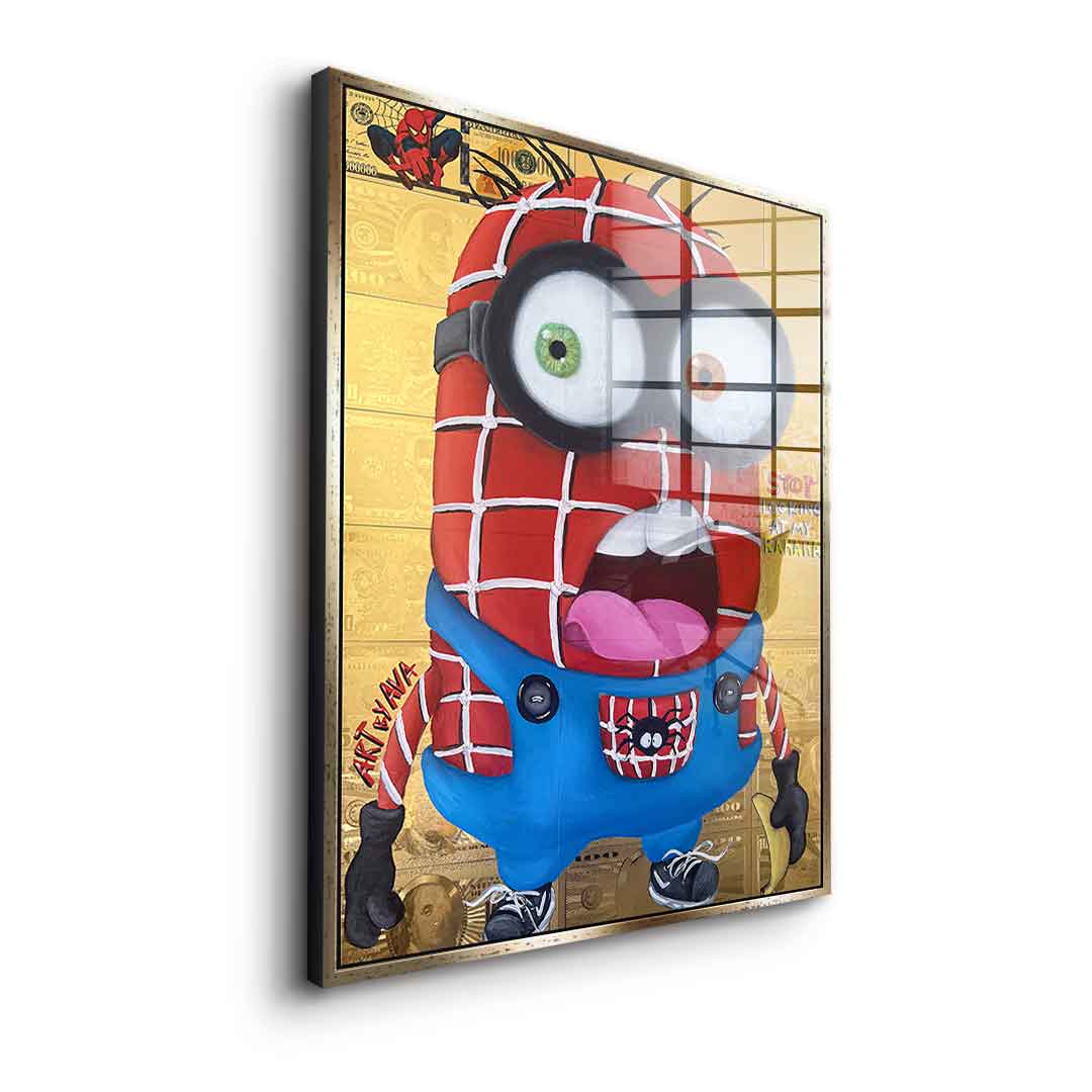 DOTCOMCANVAS® Premium Acrylglasbild mit Helferlein im Spinnenkrieger Kostüm - Motiv im Comic / Cartoon Stil.