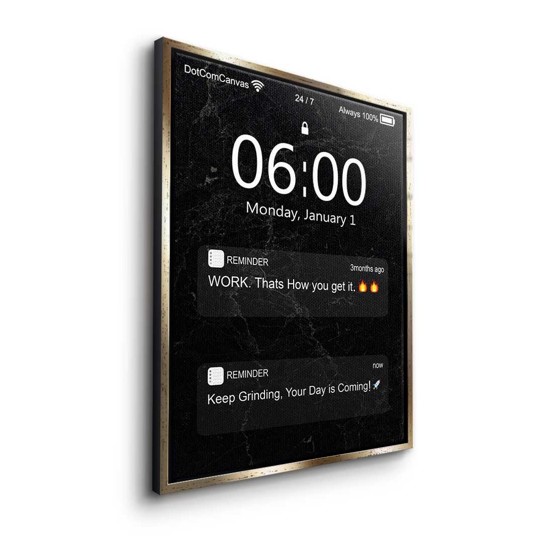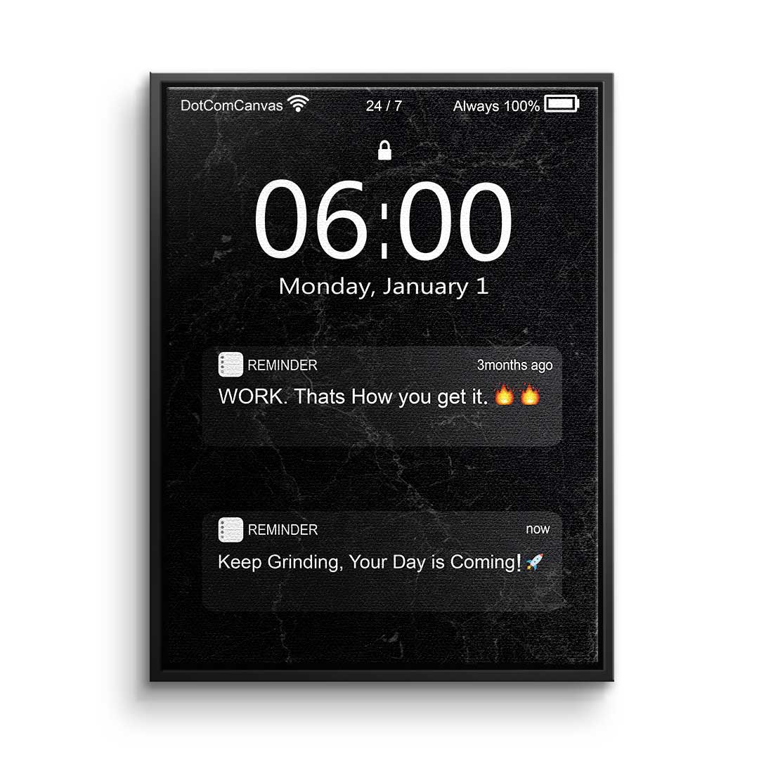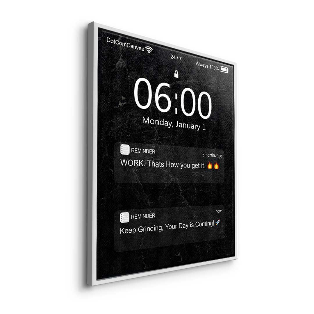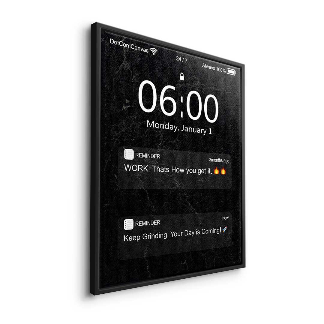 DOTCOMCANVAS® Premium Leinwandbild mit Motivationsspruch auf Handybildschirm in schwarz und weiß.