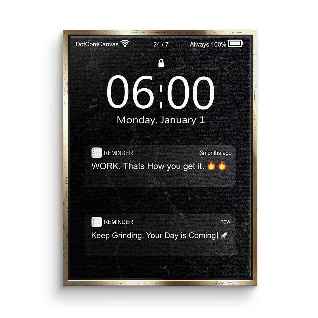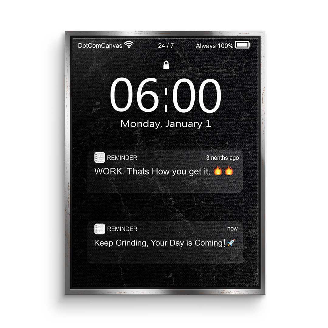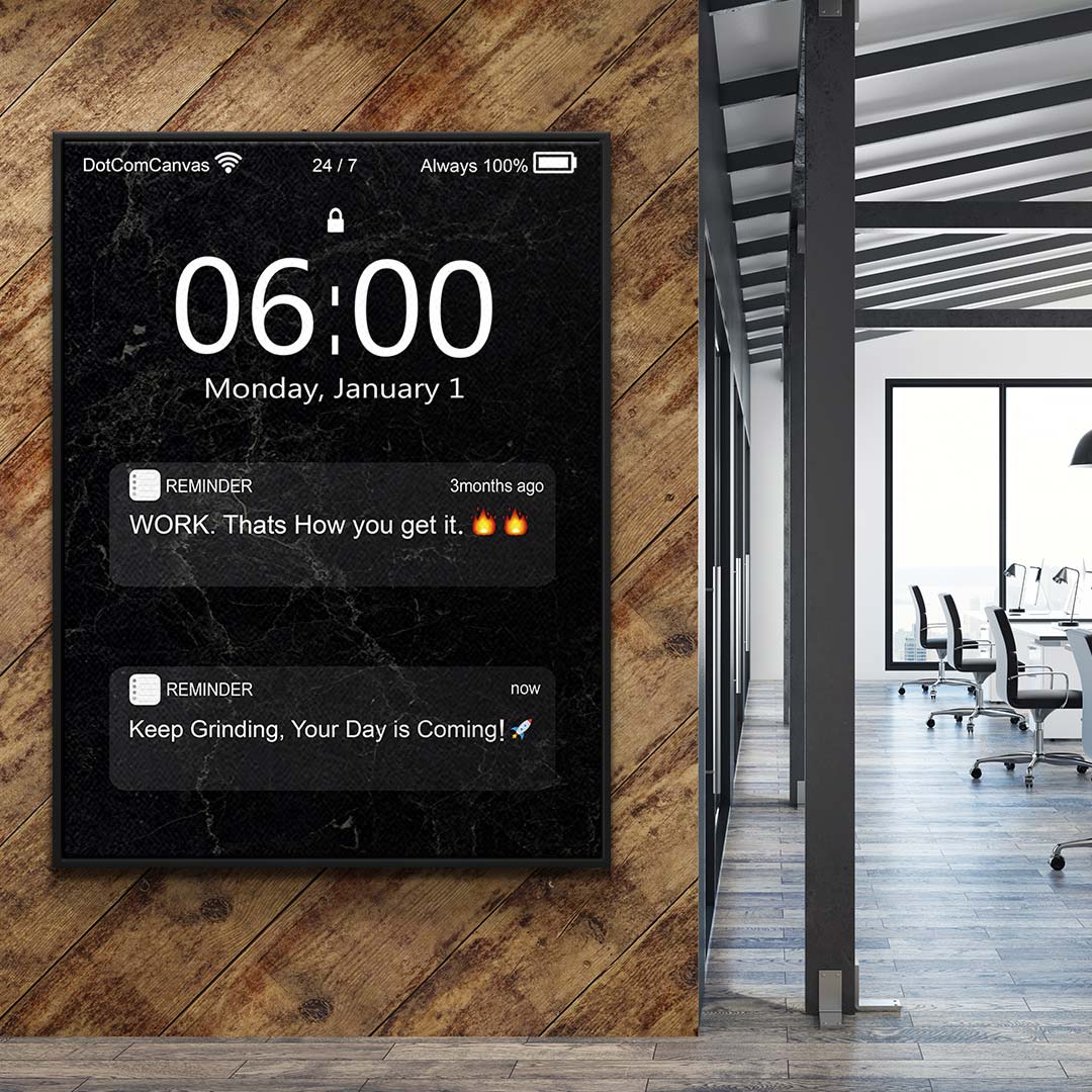 DOTCOMCANVAS® Premium Leinwandbild mit Motivationsspruch auf Handybildschirm in schwarz und weiß.