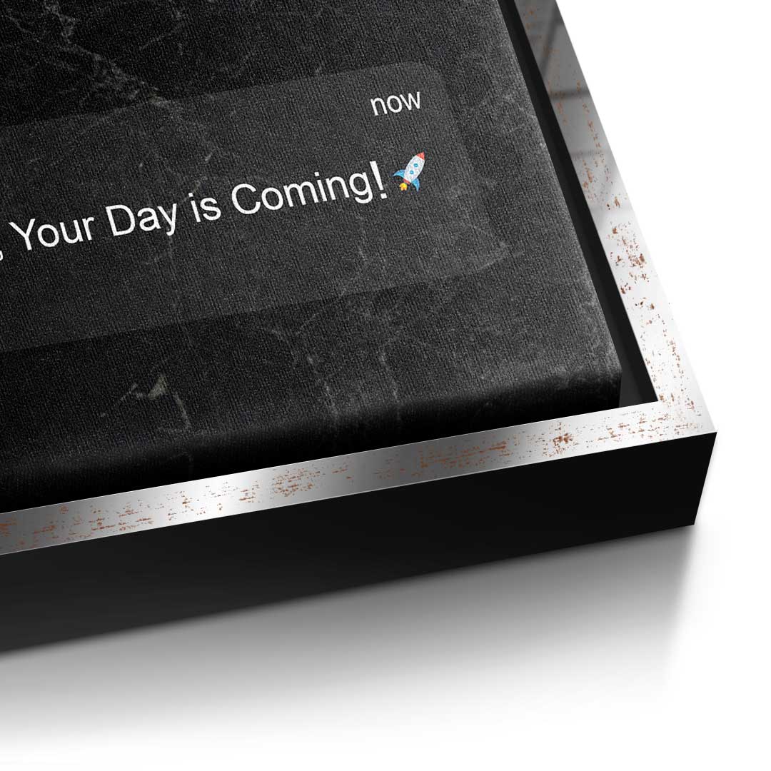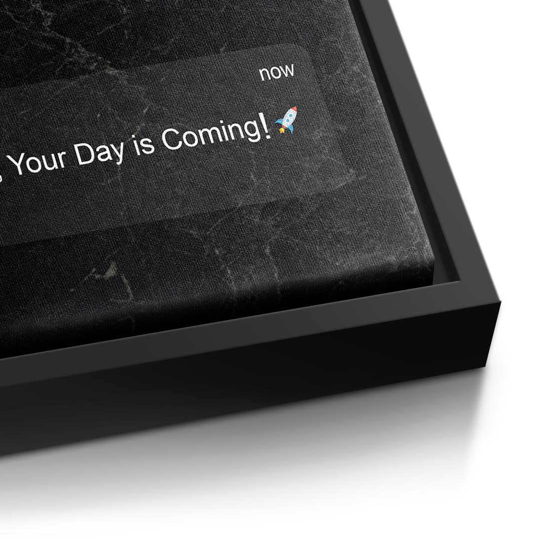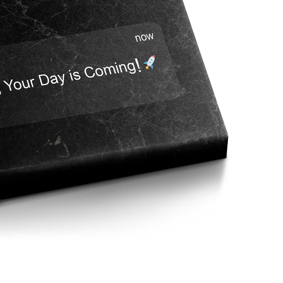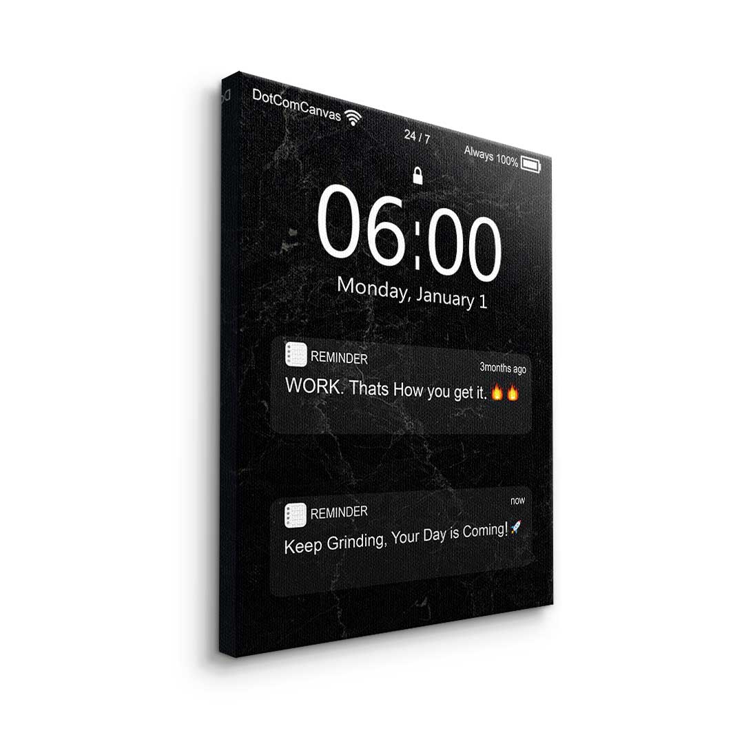 DOTCOMCANVAS® Premium Leinwandbild mit Motivationsspruch auf Handybildschirm in schwarz und weiß.