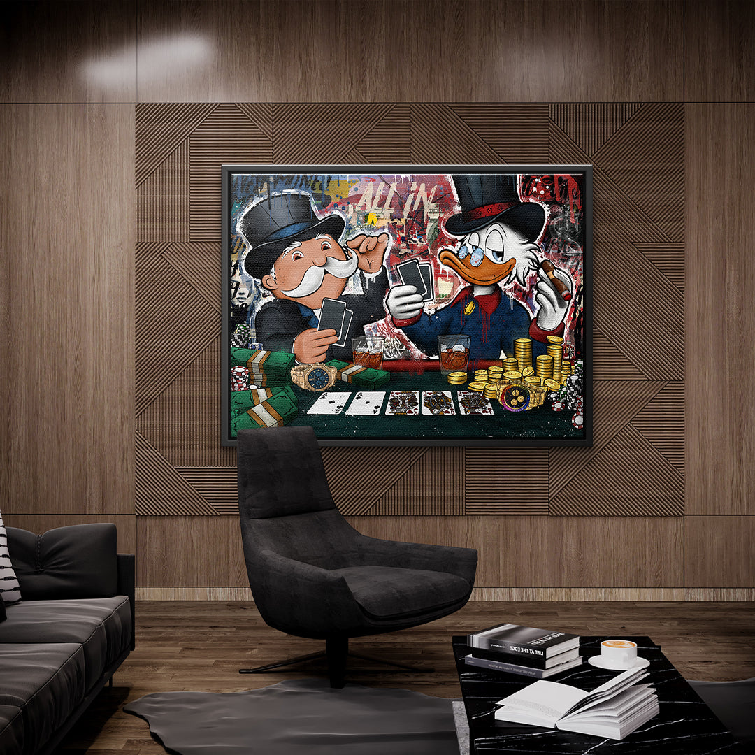 Das Kunstwerk präsentiert zwei charismatische Charakter, die gegeneinander Poker spielen. Die energetische Stimmung und die Chance alles zu gewinnen treibt die beiden an. Scheinbar hat der rechte Charakter die besseren Karten. Wenn du ganz genau hinschaust, sieht du die Reflexion in seiner Brille!
