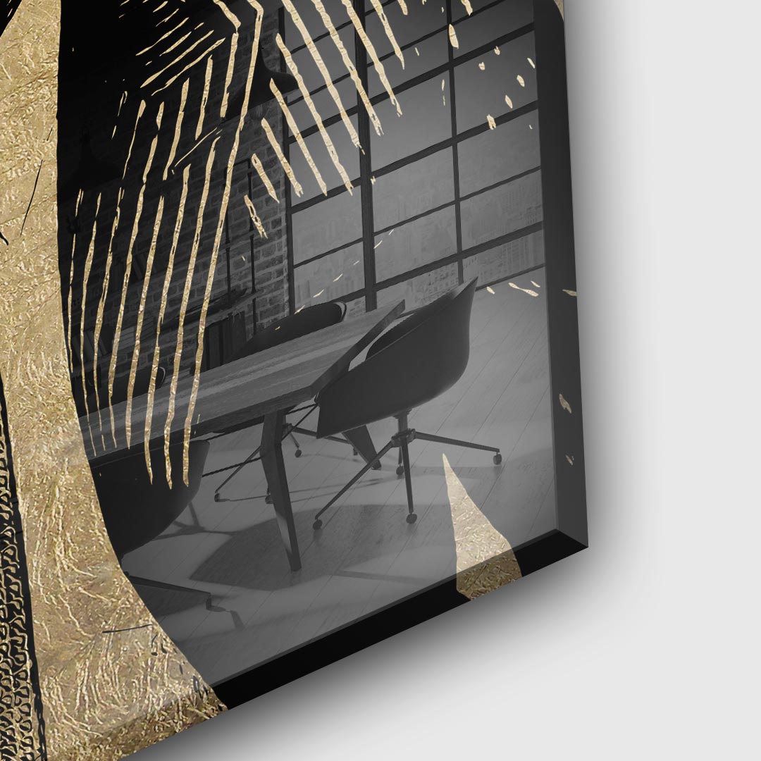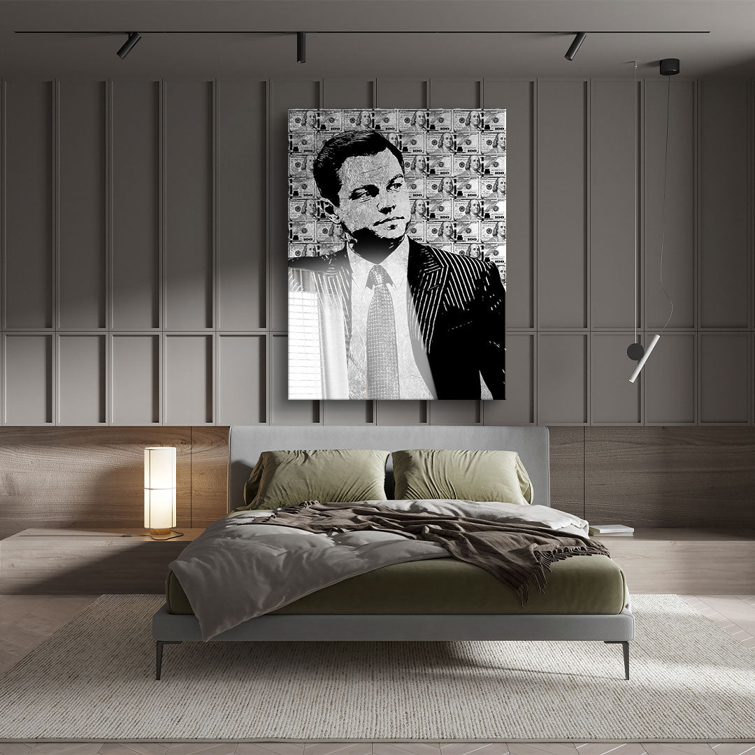 DOTCOMCANVAS® Premium Acrylglasbild mit abstrakten schwarzen Portrait und Dollar Hintergrund - in den Ausführungen Gold & Silber.