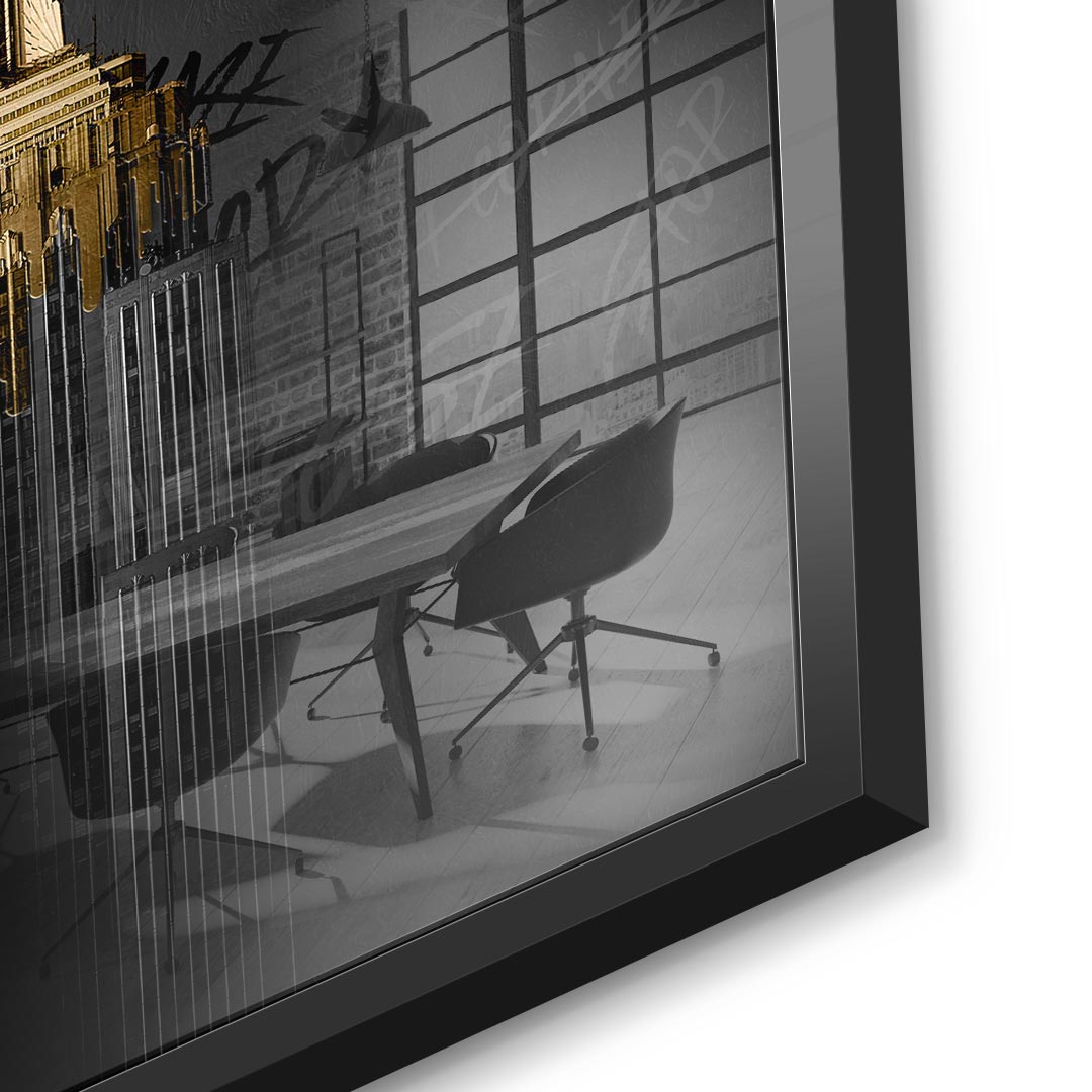 DOTCOMCANVAS® Premium Acrylglasbild mit dem Empire State Building und dem Motivationsspruch "Start small think BIG" in edlem gold-schwarzen Design.
