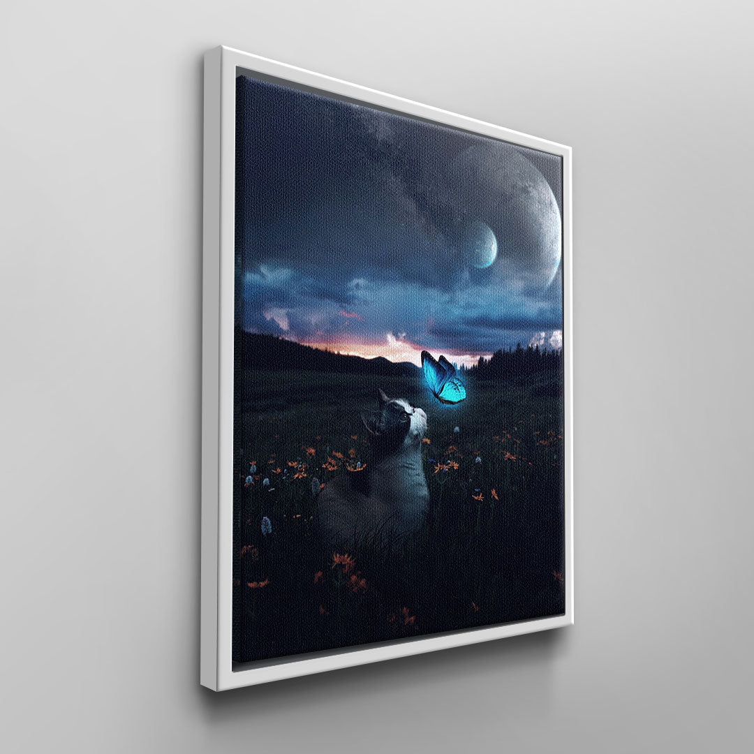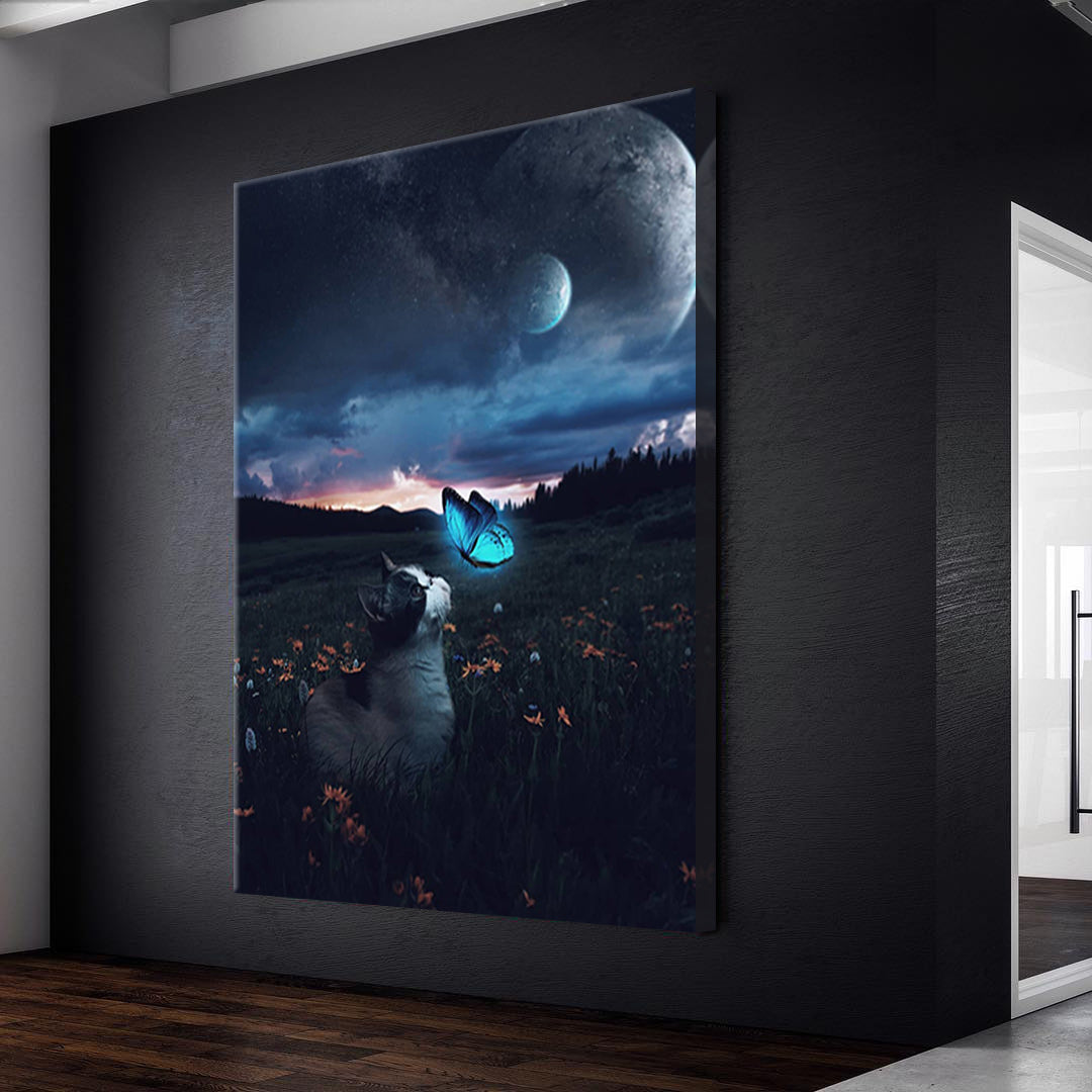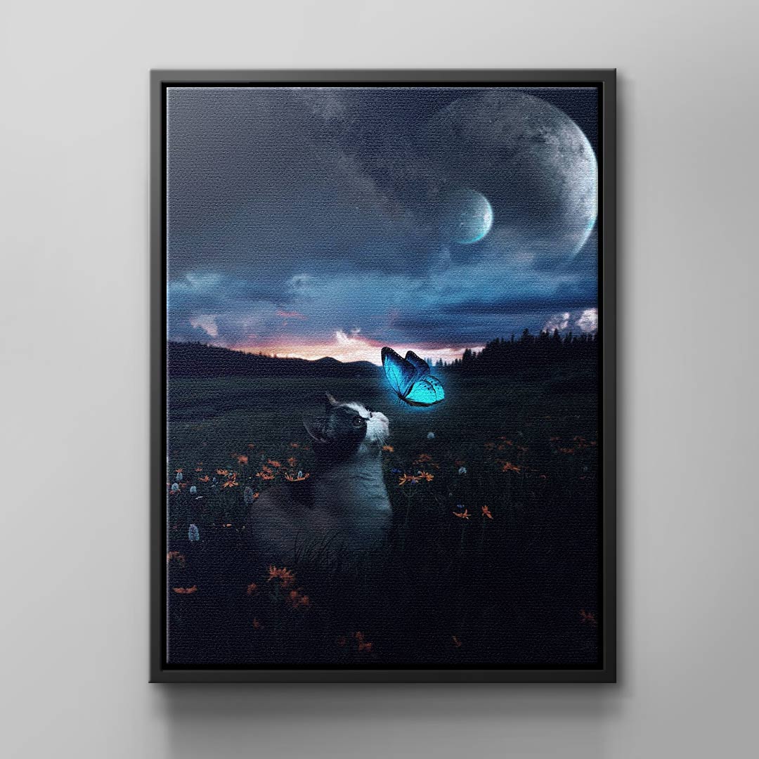 DOTCOMCANVAS® Wandbild Natur Mond Katze Schmetterling Blume blau rosa grün Beautiful Meeting