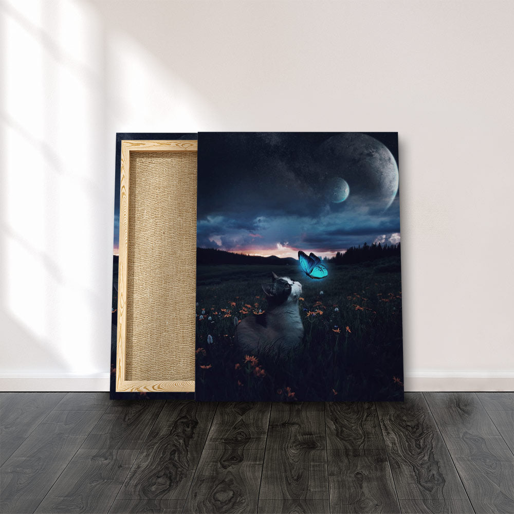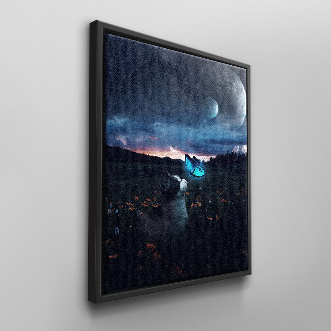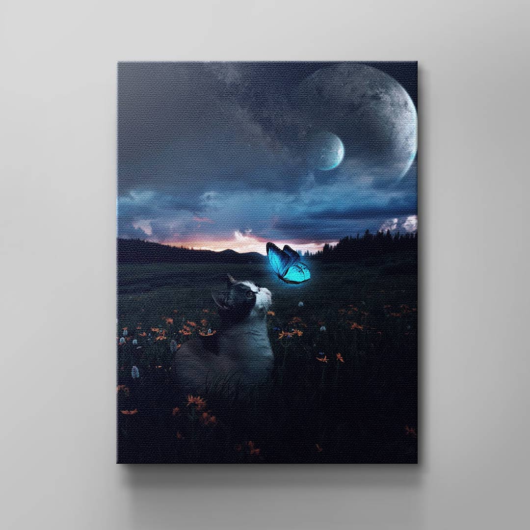 DOTCOMCANVAS® Wandbild Natur Mond Katze Schmetterling Blume blau rosa grün Beautiful Meeting