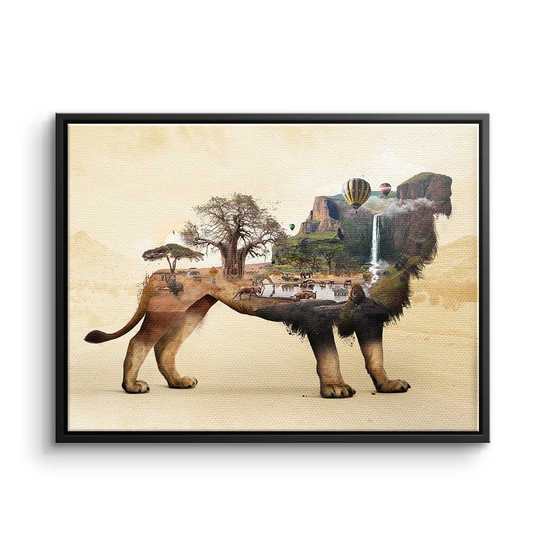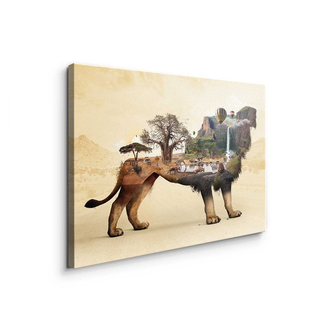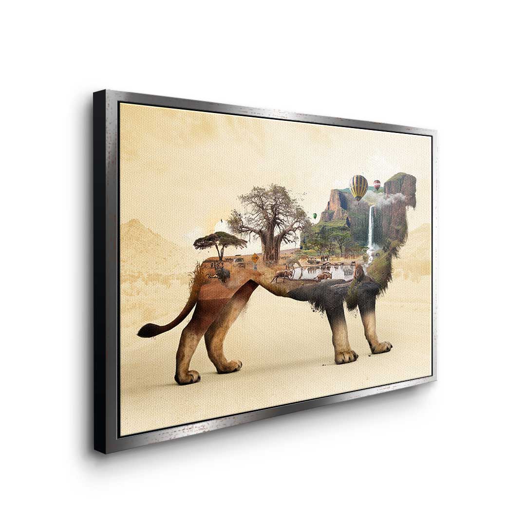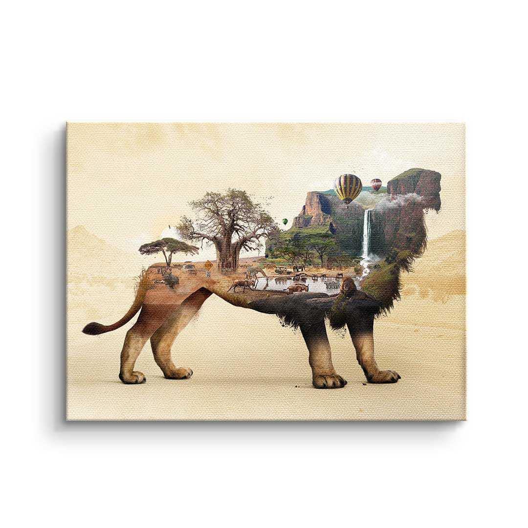 DOTCOMCANVAS® Premium Leinwandbild mit surrealistischem Löwenmotiv in Braun, Geld und Orange.
