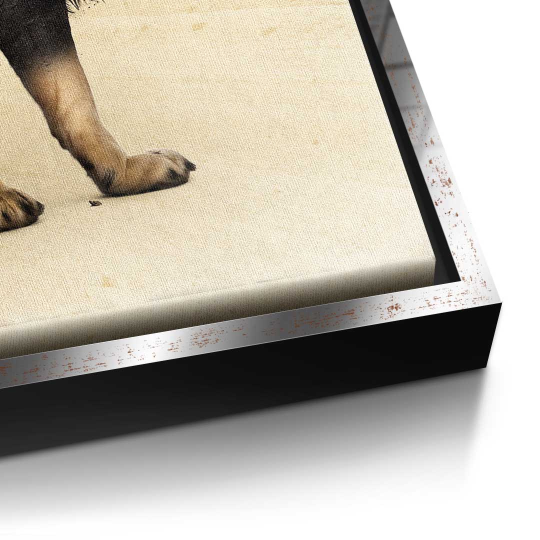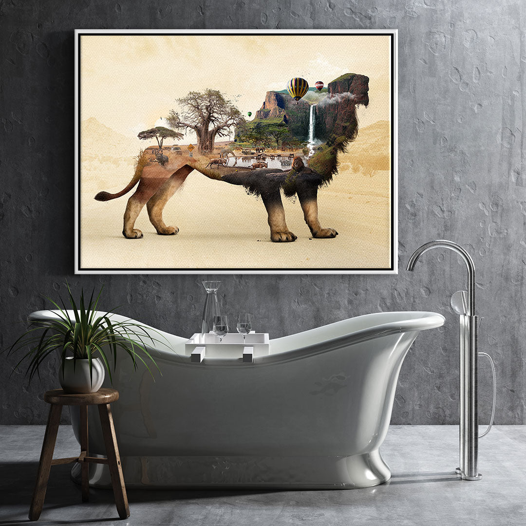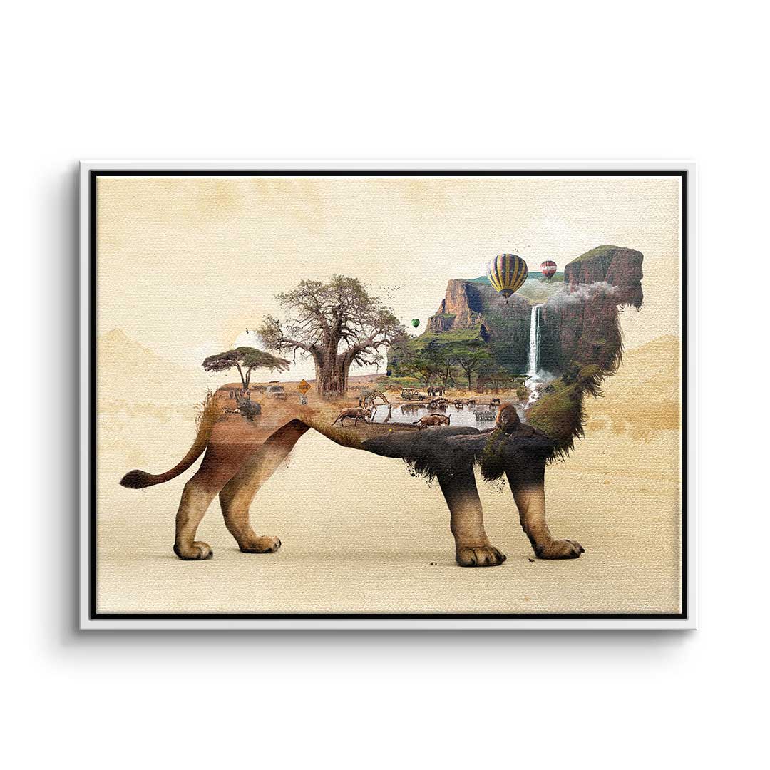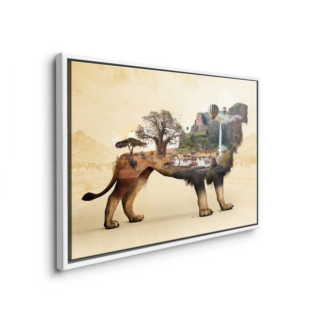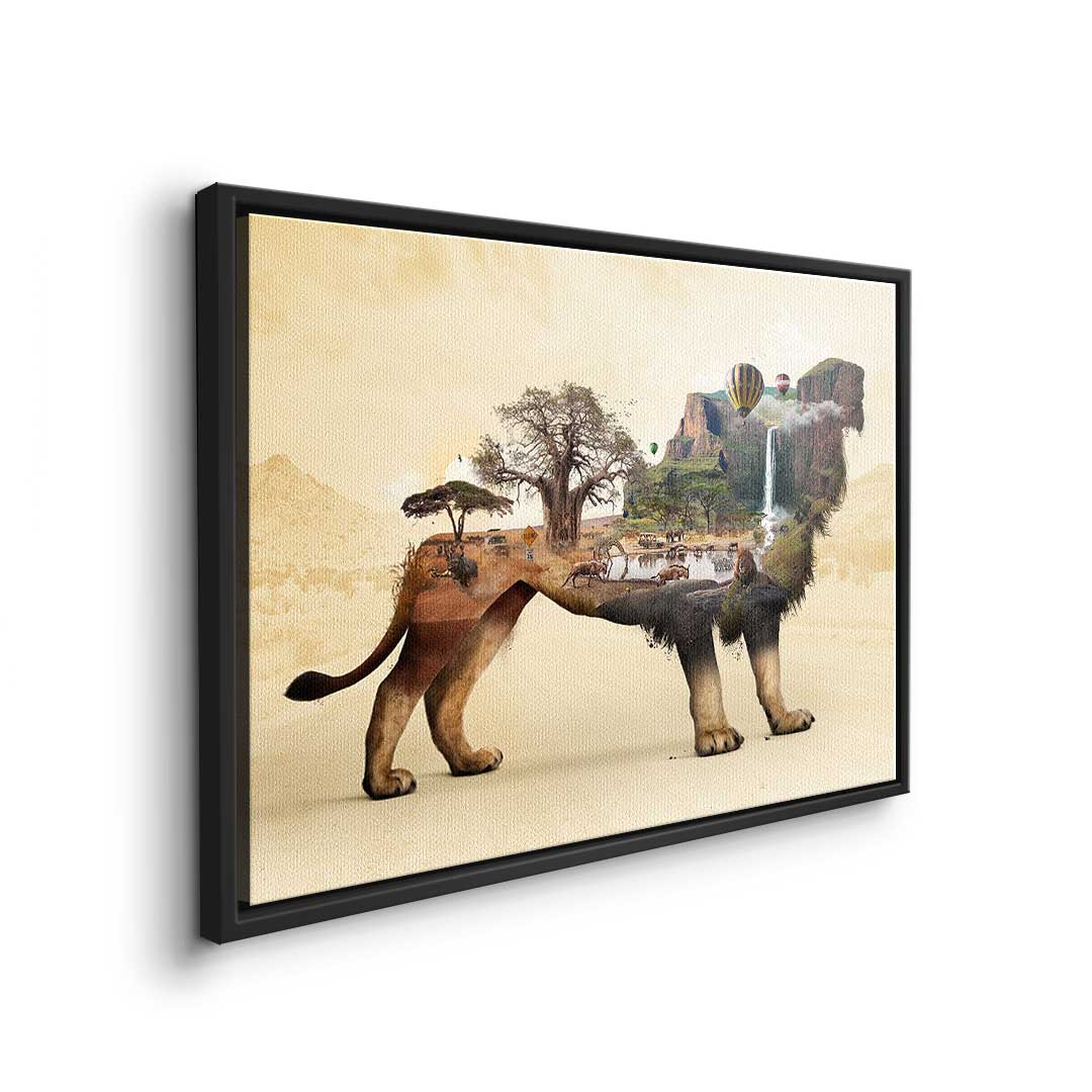 DOTCOMCANVAS® Premium Leinwandbild mit surrealistischem Löwenmotiv in Braun, Geld und Orange.