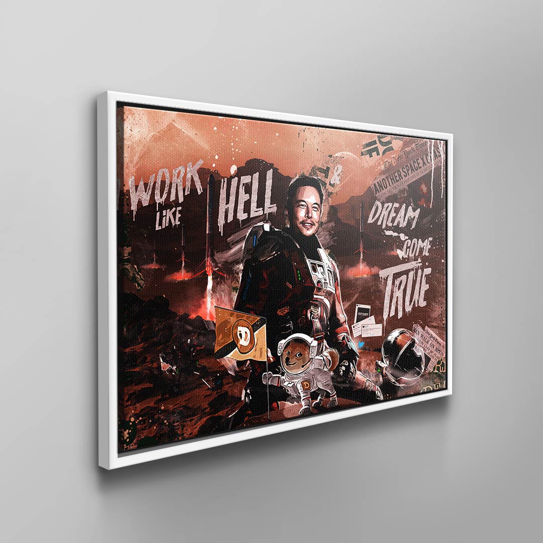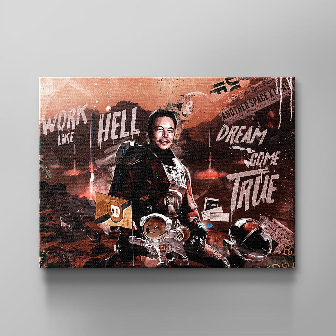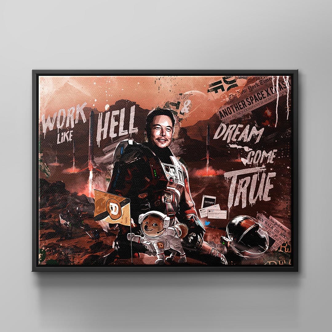 DOTCOMCANVAS® Wandbild mit provokanten und kreativen Elon Musk Motiv "Work like Hell, Dream come True."