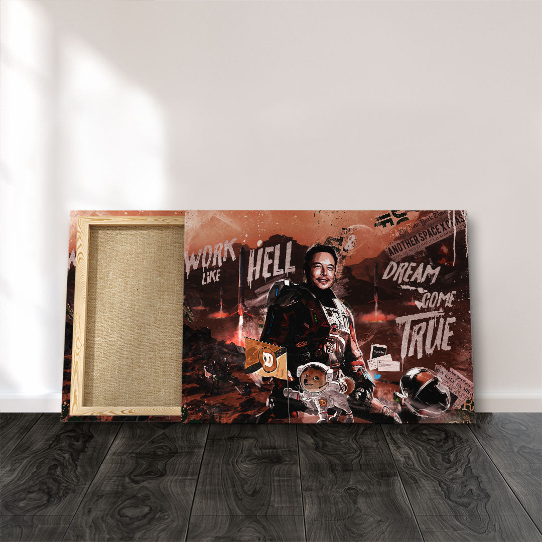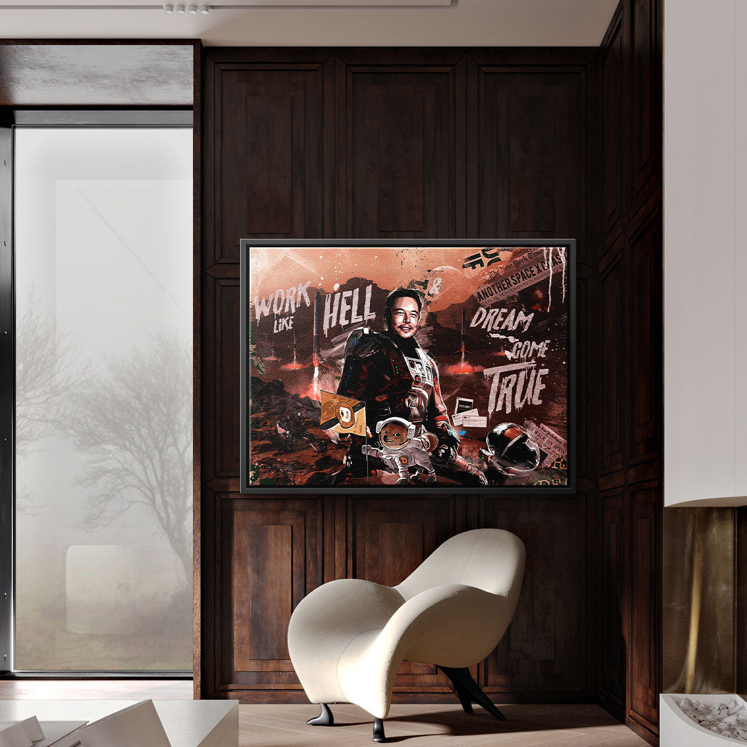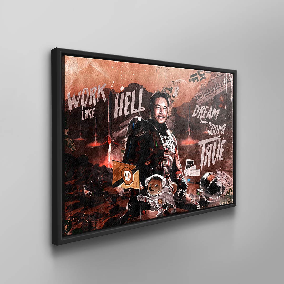 DOTCOMCANVAS® Wandbild mit provokanten und kreativen Elon Musk Motiv "Work like Hell, Dream come True."