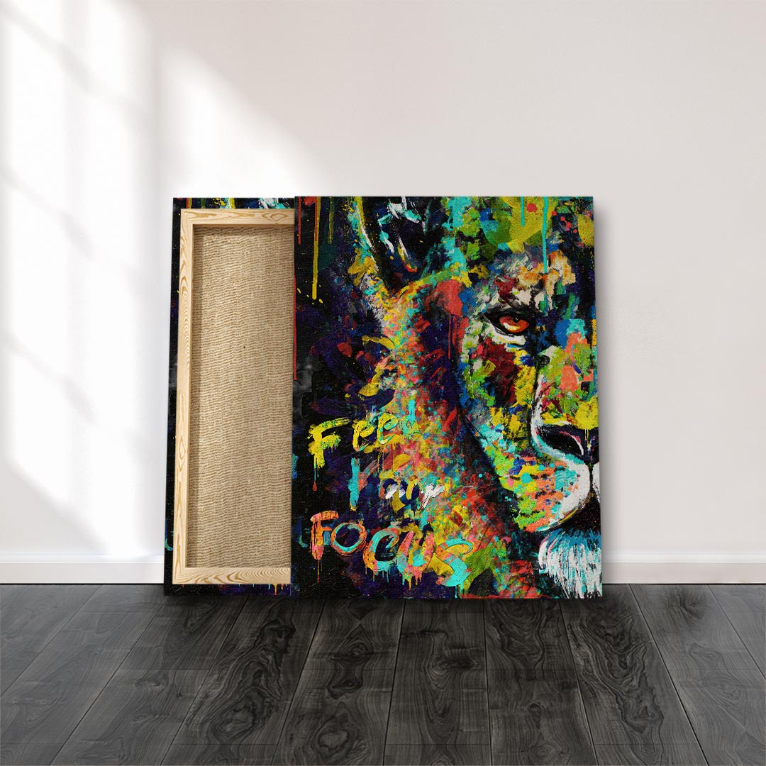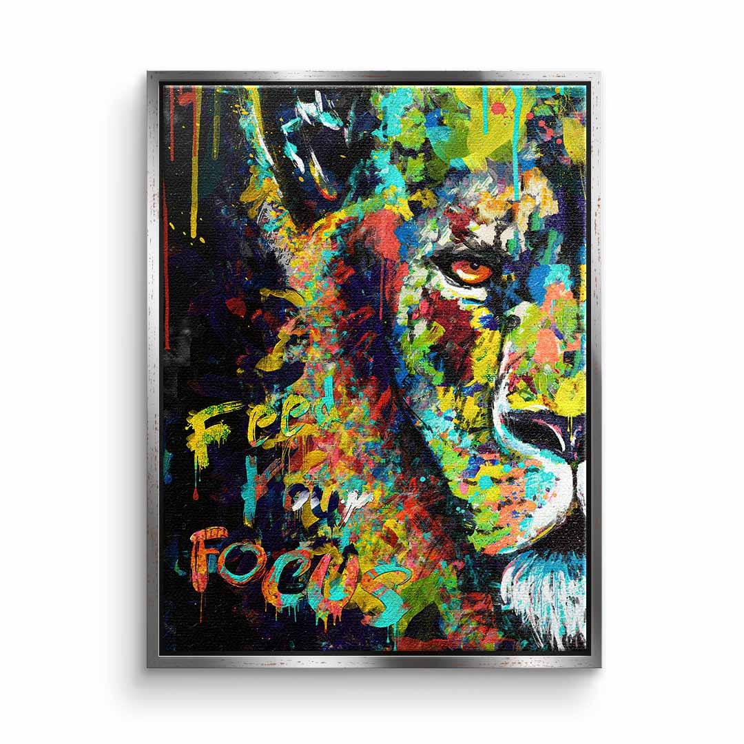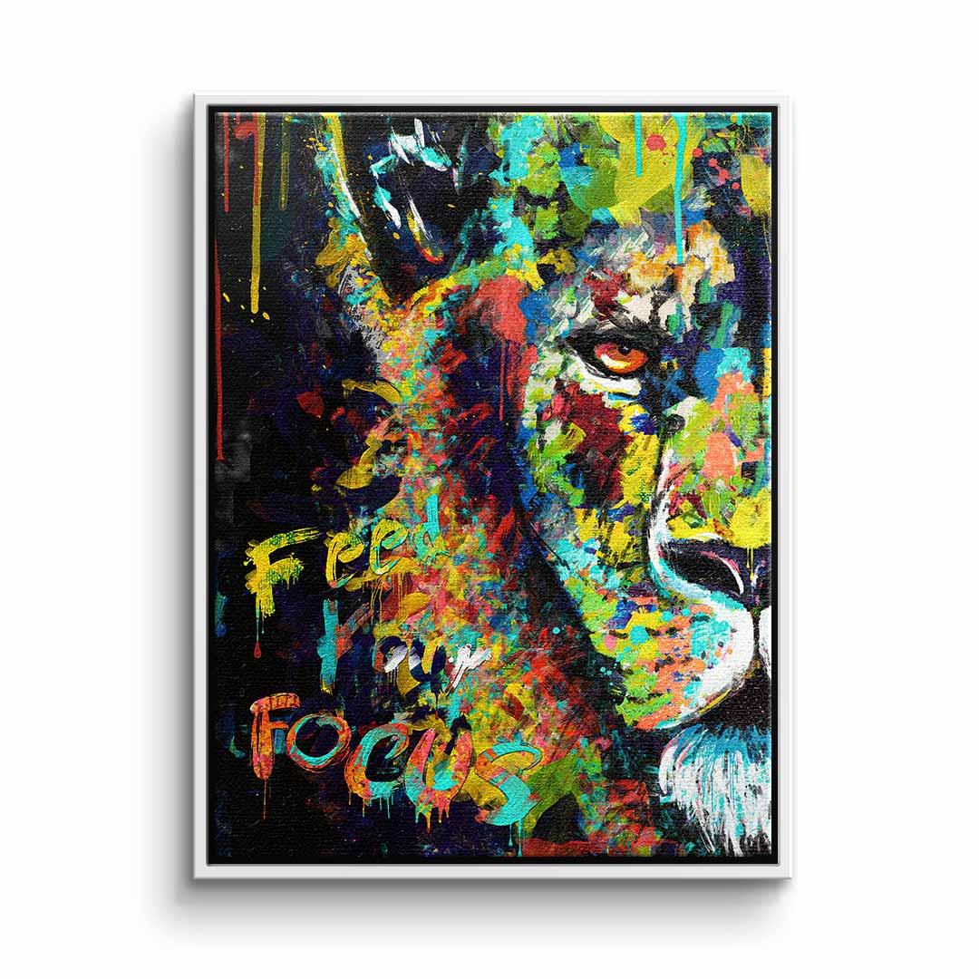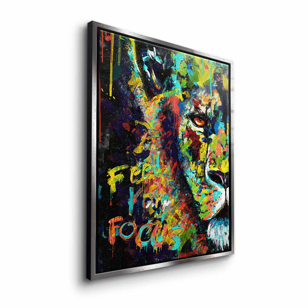 DOTCOMCANVAS® Premium Leinwandbild mit motivierendem Löwen - Motiv und Schriftzug "Feed your focus".