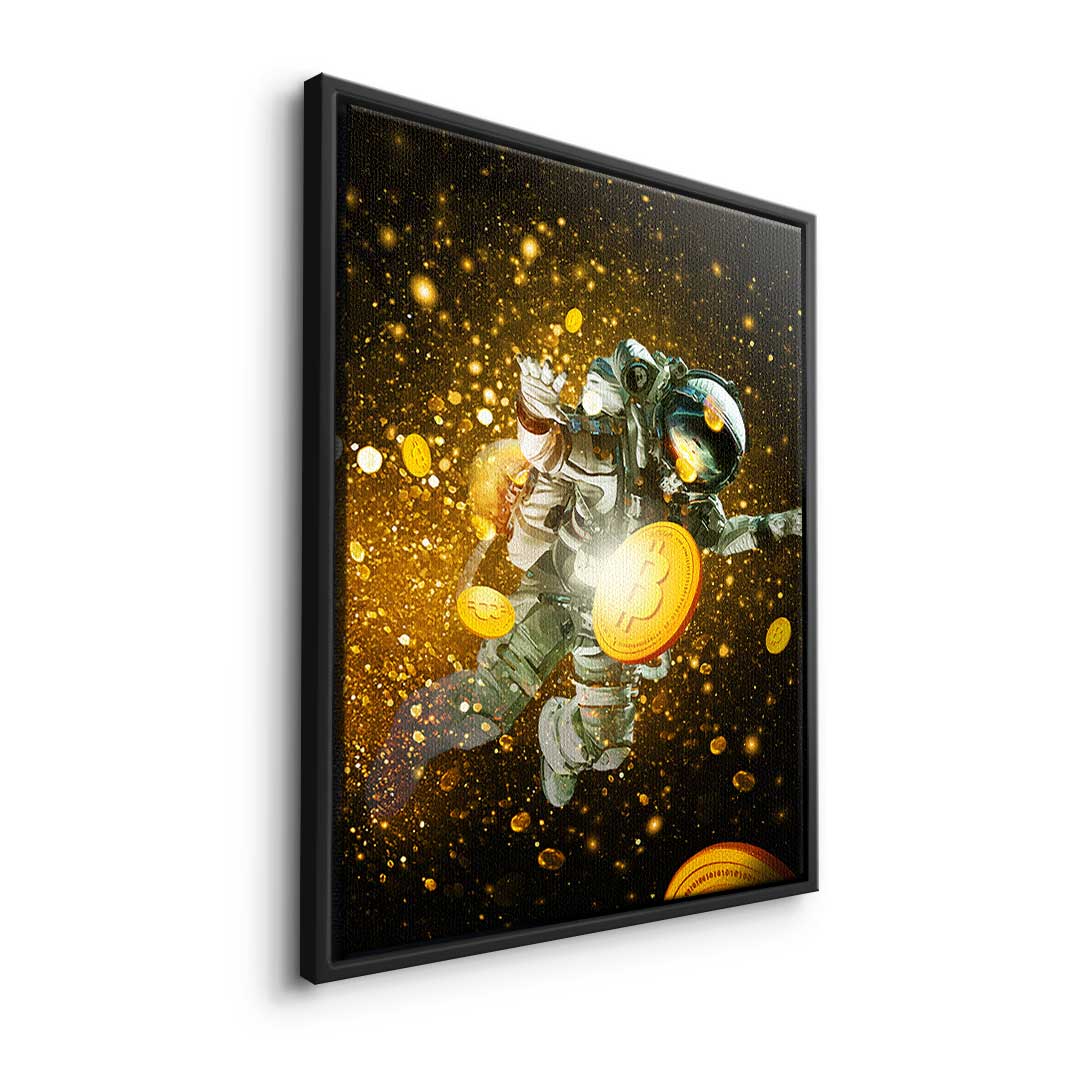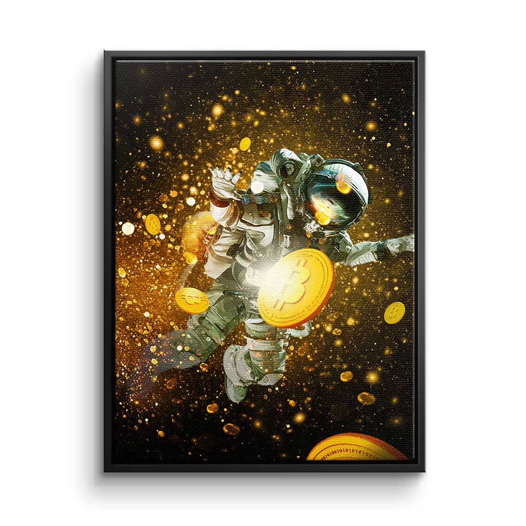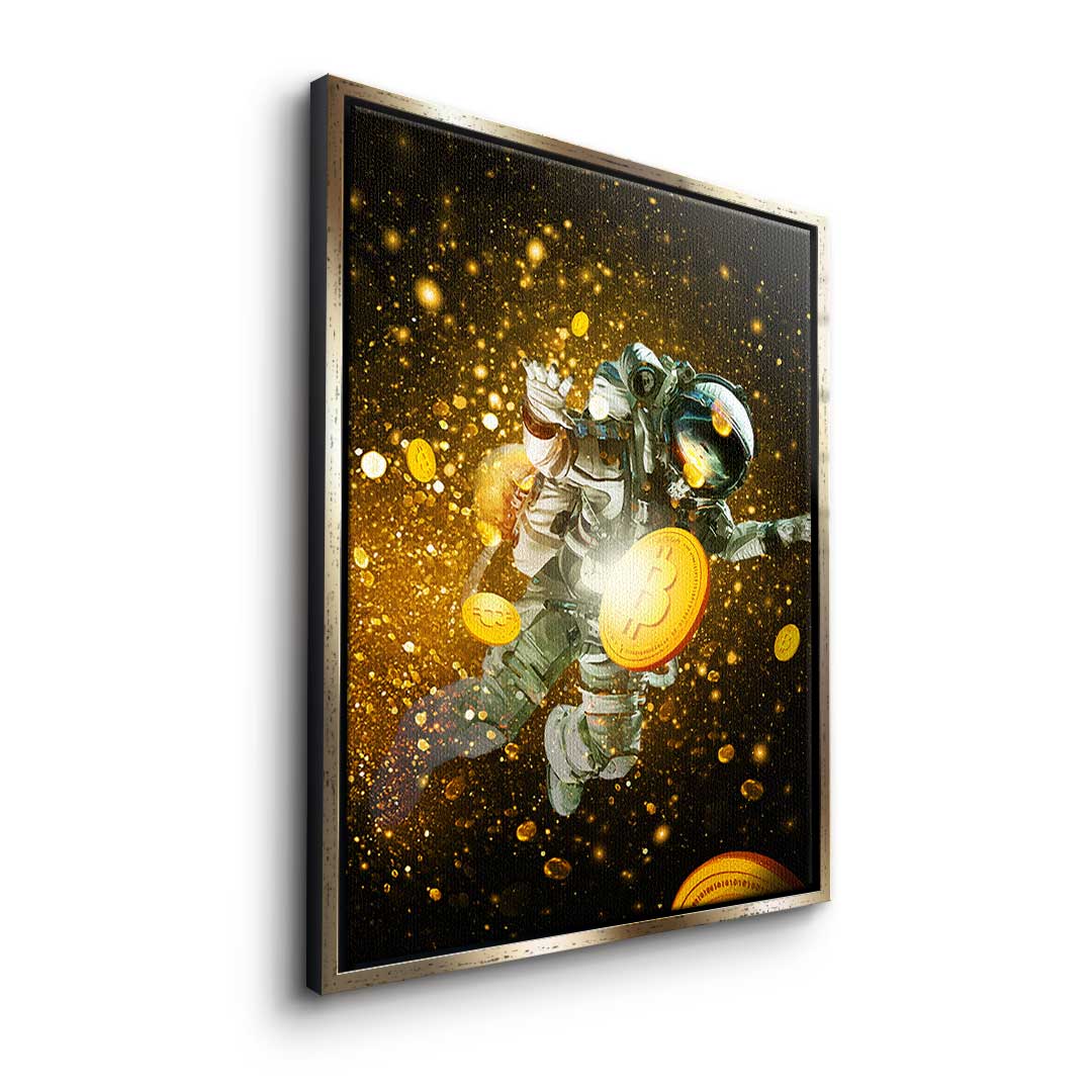 DOTCOMCANVAS® Premium Leinwandbild im Pop Art Stil mit Astronauten und Bitcoin im Weltall.