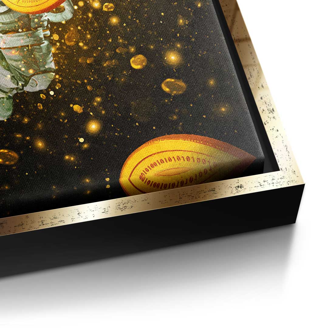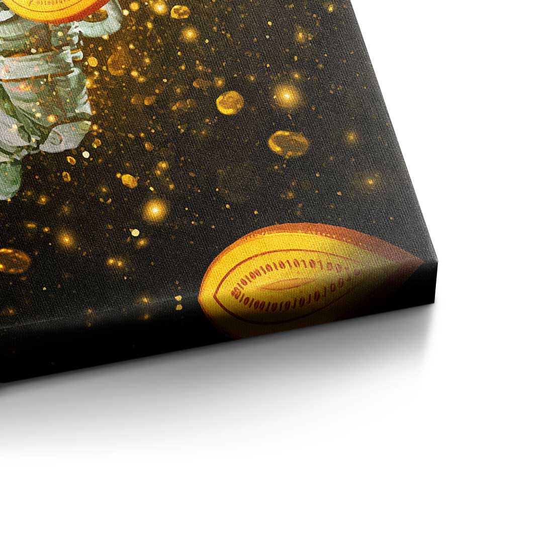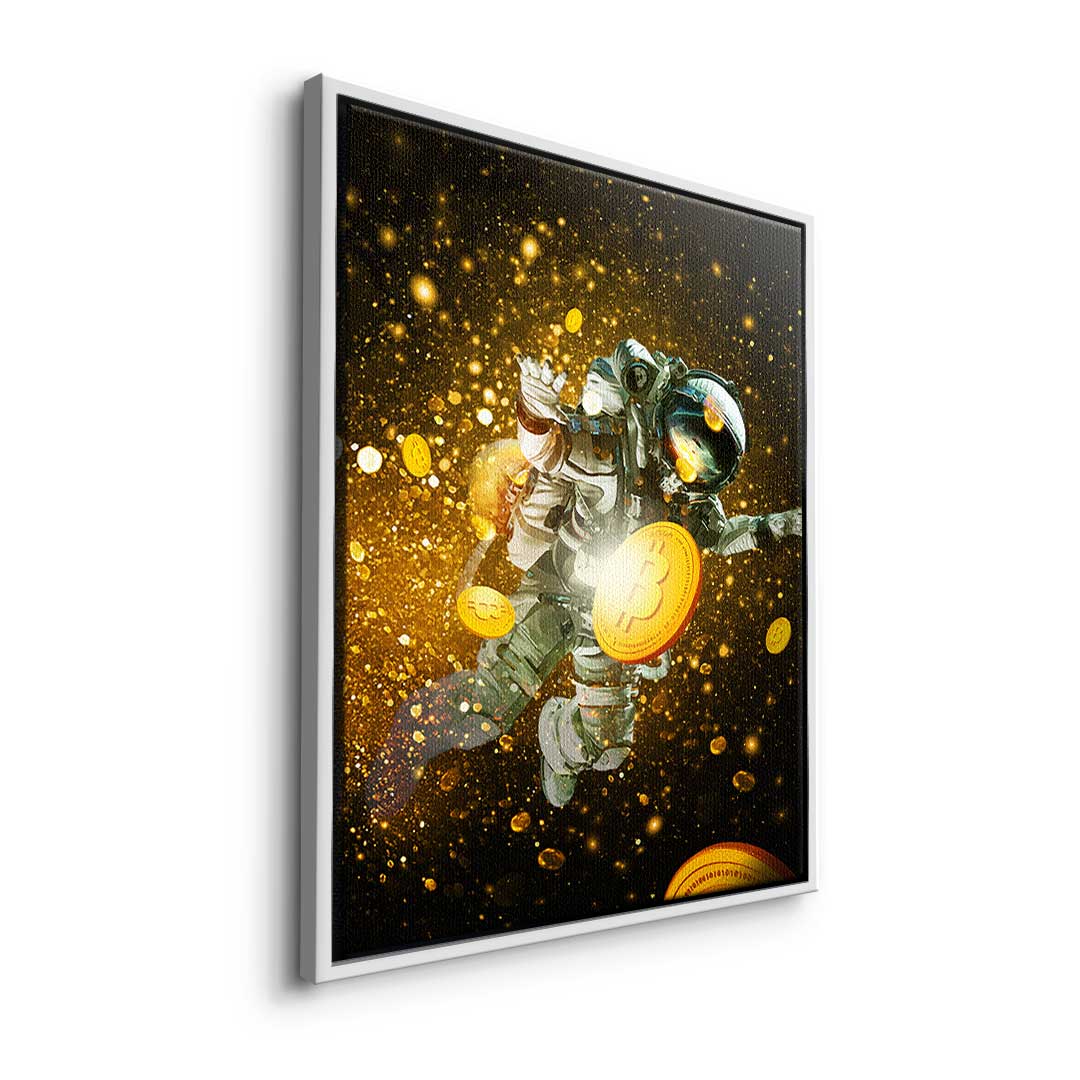 DOTCOMCANVAS® Premium Leinwandbild im Pop Art Stil mit Astronauten und Bitcoin im Weltall.