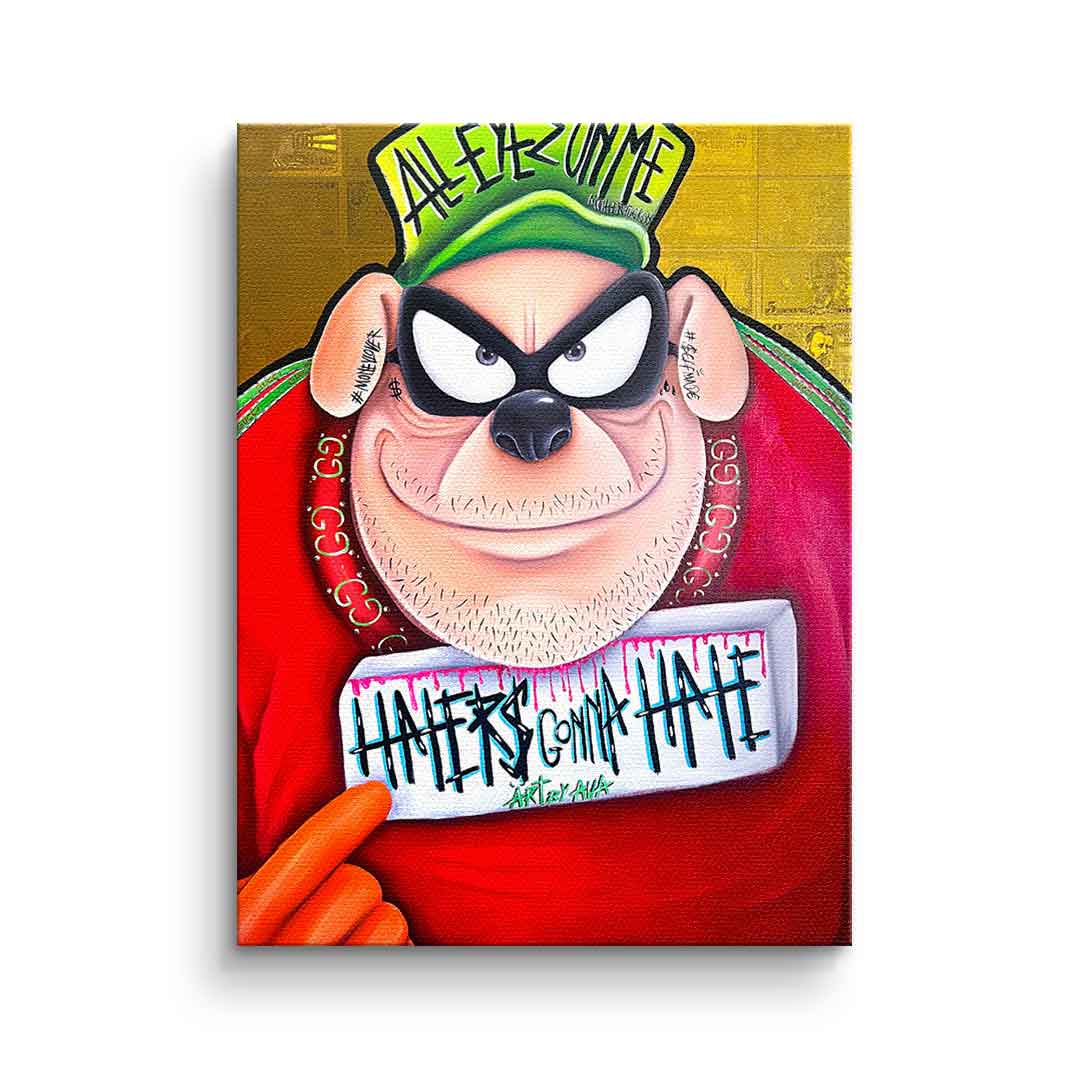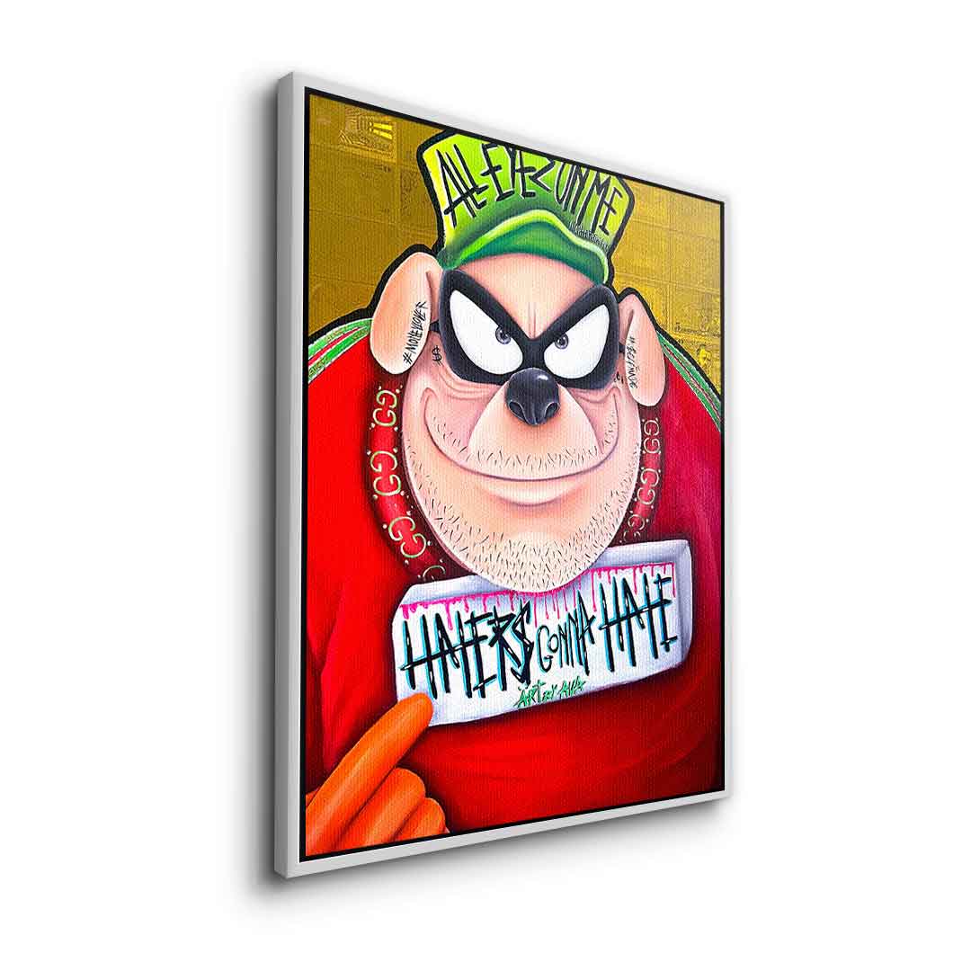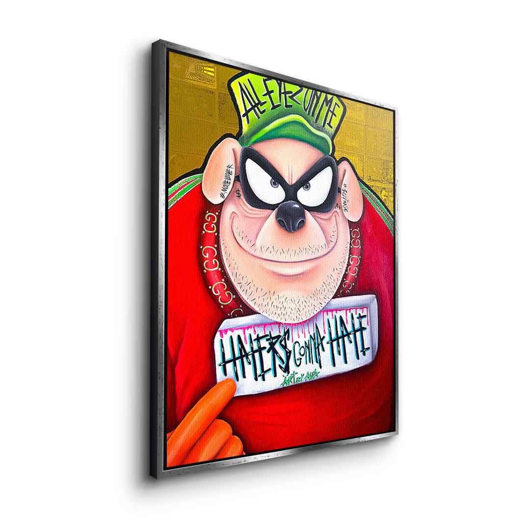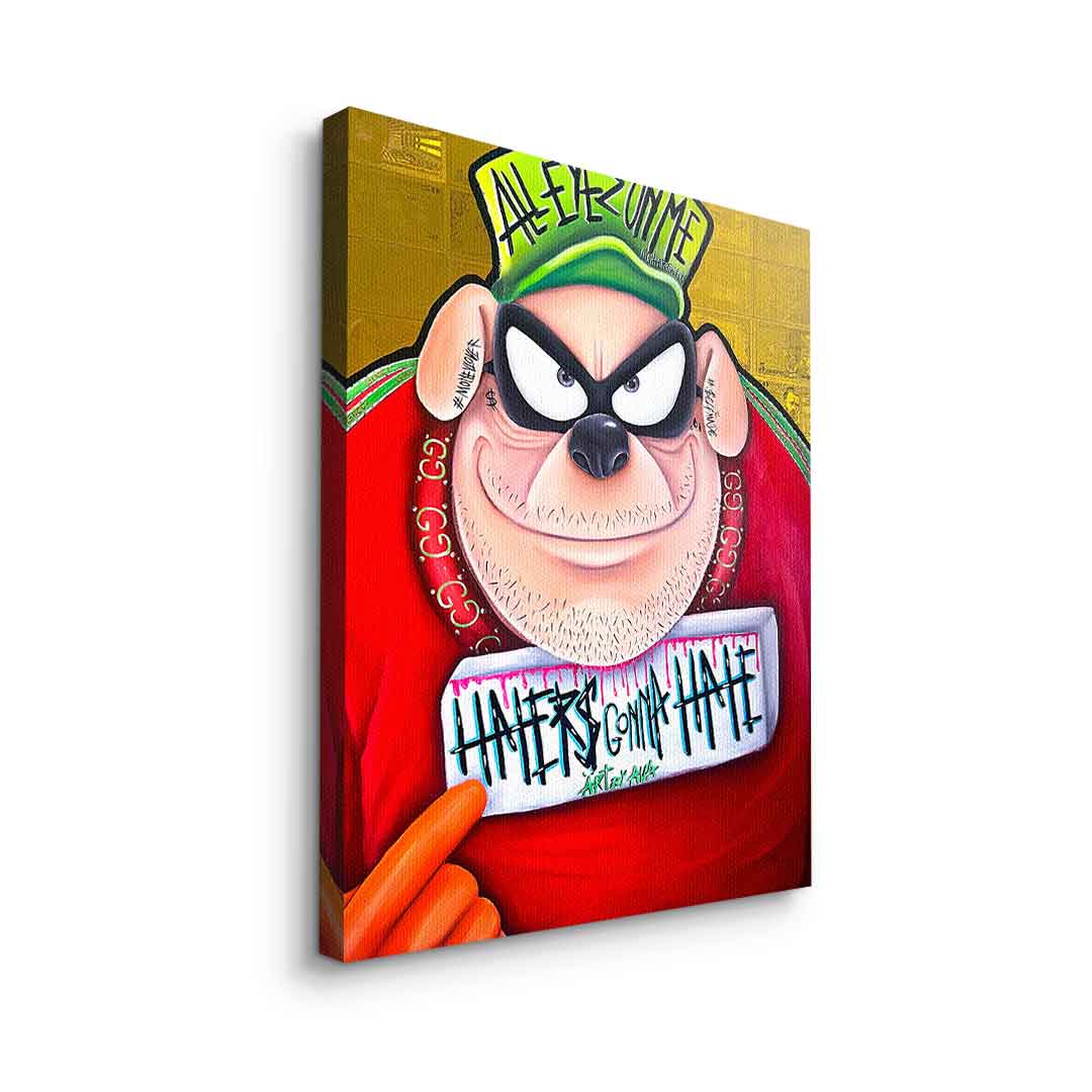 DOTCOMCANVAS® Premium Leinwandbild mit einem der Panzerknacker aus Entenhausen als Motiv im Comic / Cartoon Stil mit Schriftzug "Haters gonna hate".