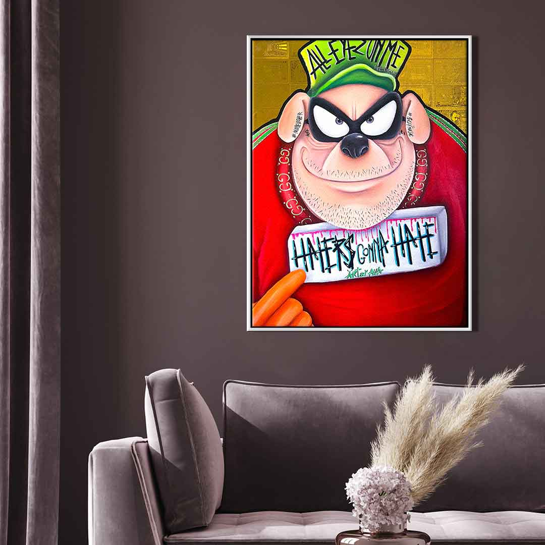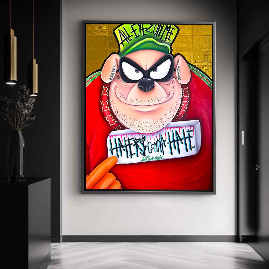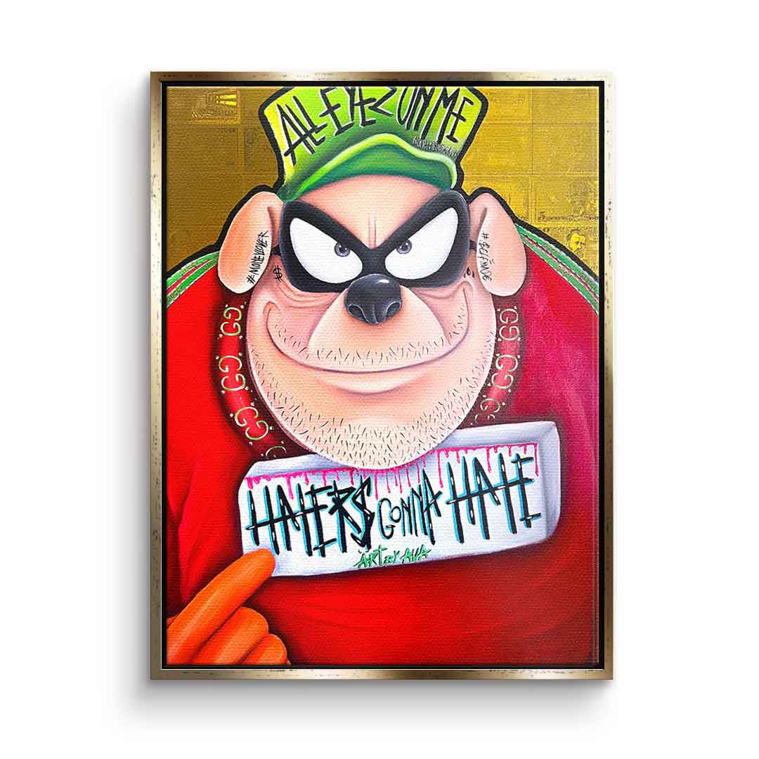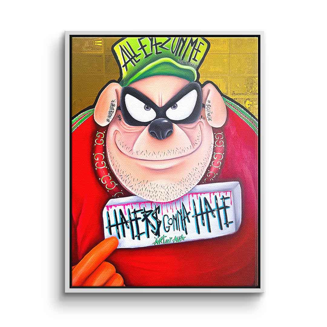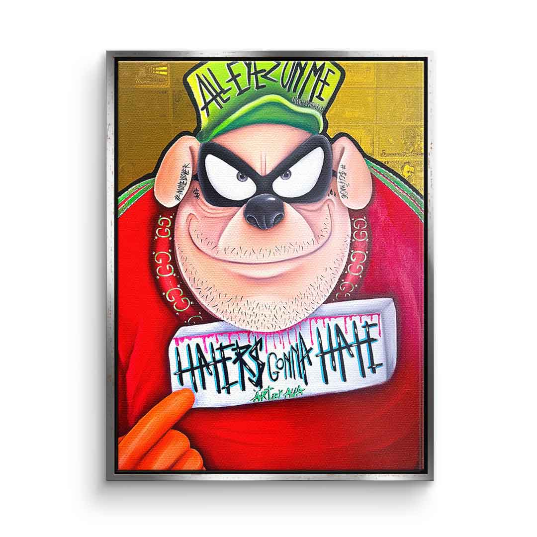 DOTCOMCANVAS® Premium Leinwandbild mit einem der Panzerknacker aus Entenhausen als Motiv im Comic / Cartoon Stil mit Schriftzug "Haters gonna hate".