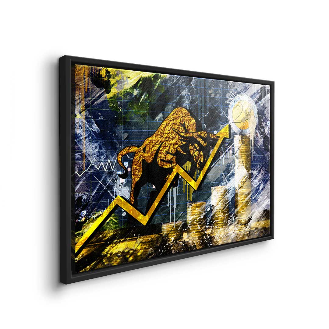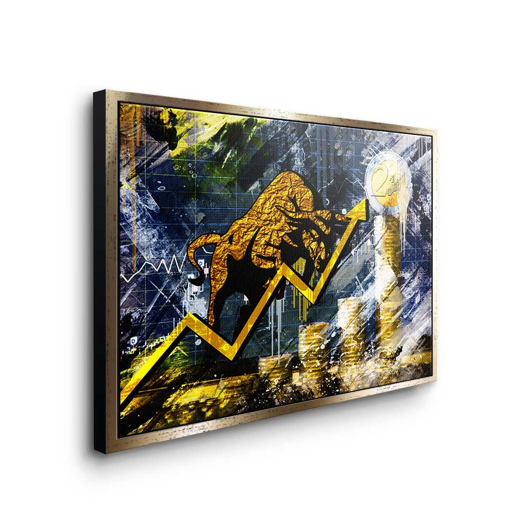 DOTCOMCANVAS® Premium Leinwandbild mit Bullen und Graphen im Pop Art Stil in Gold und Blau.