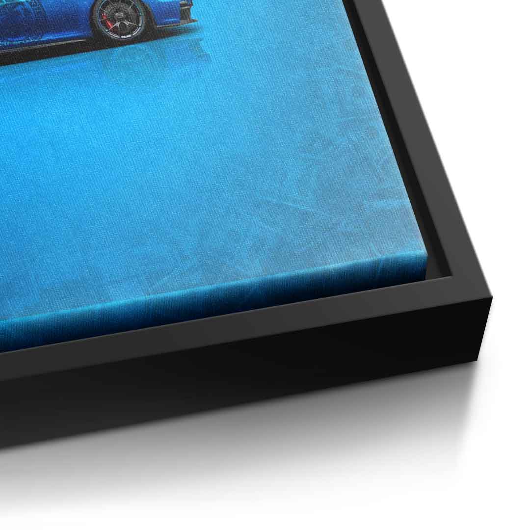 DOTCOMCANVAS® Premium Leinwandbild mit blauem Der Klassiker GT3 und Schriftzug Money easy - Motiv.