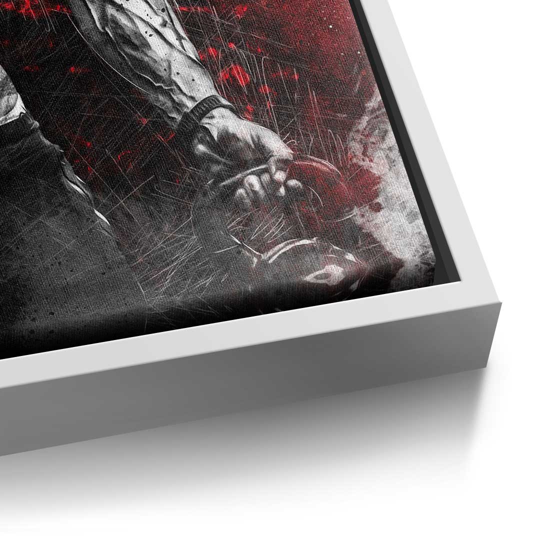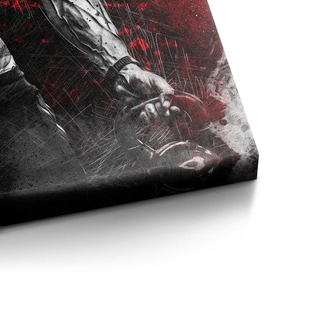 DOTCOMCANVAS® Premium Leinwandbild mit motivierendem Schriftzug "TRAIN LIKE A BEAST" und Bodybuilder in Rot, Silber und Schwarz.