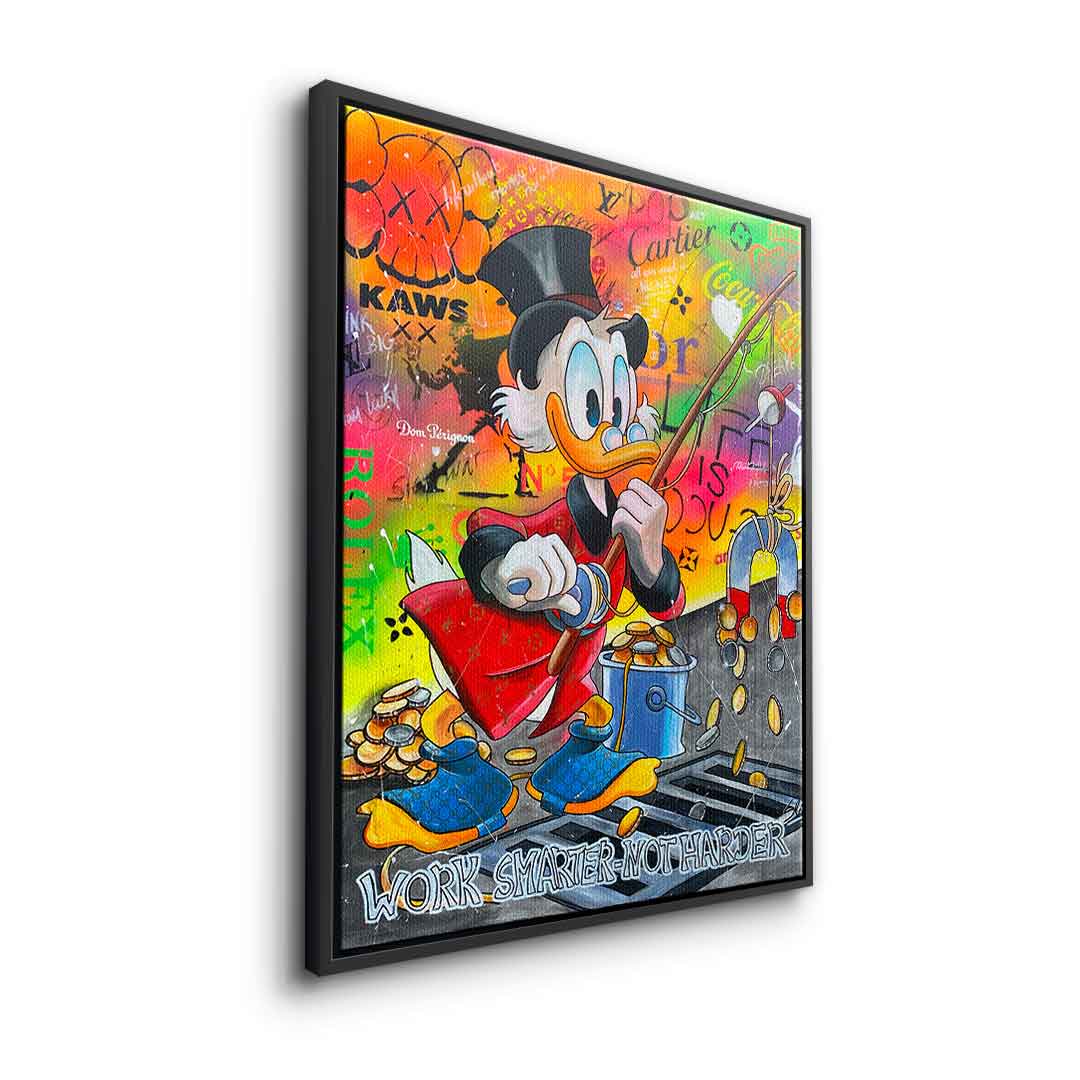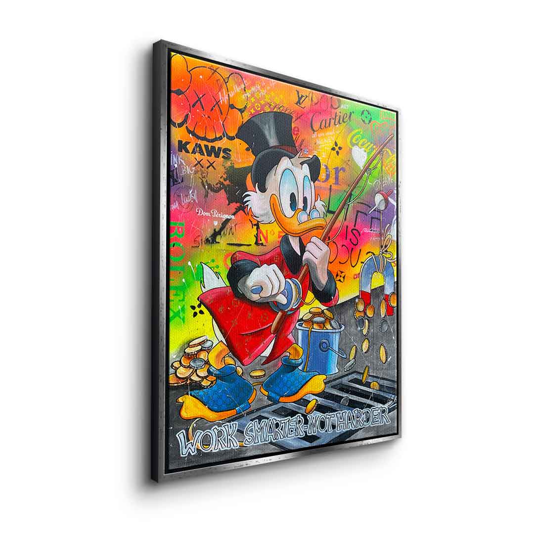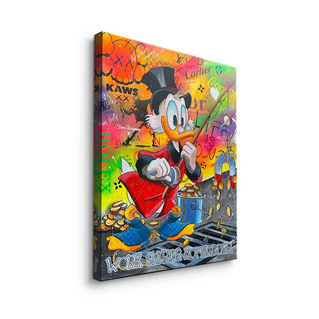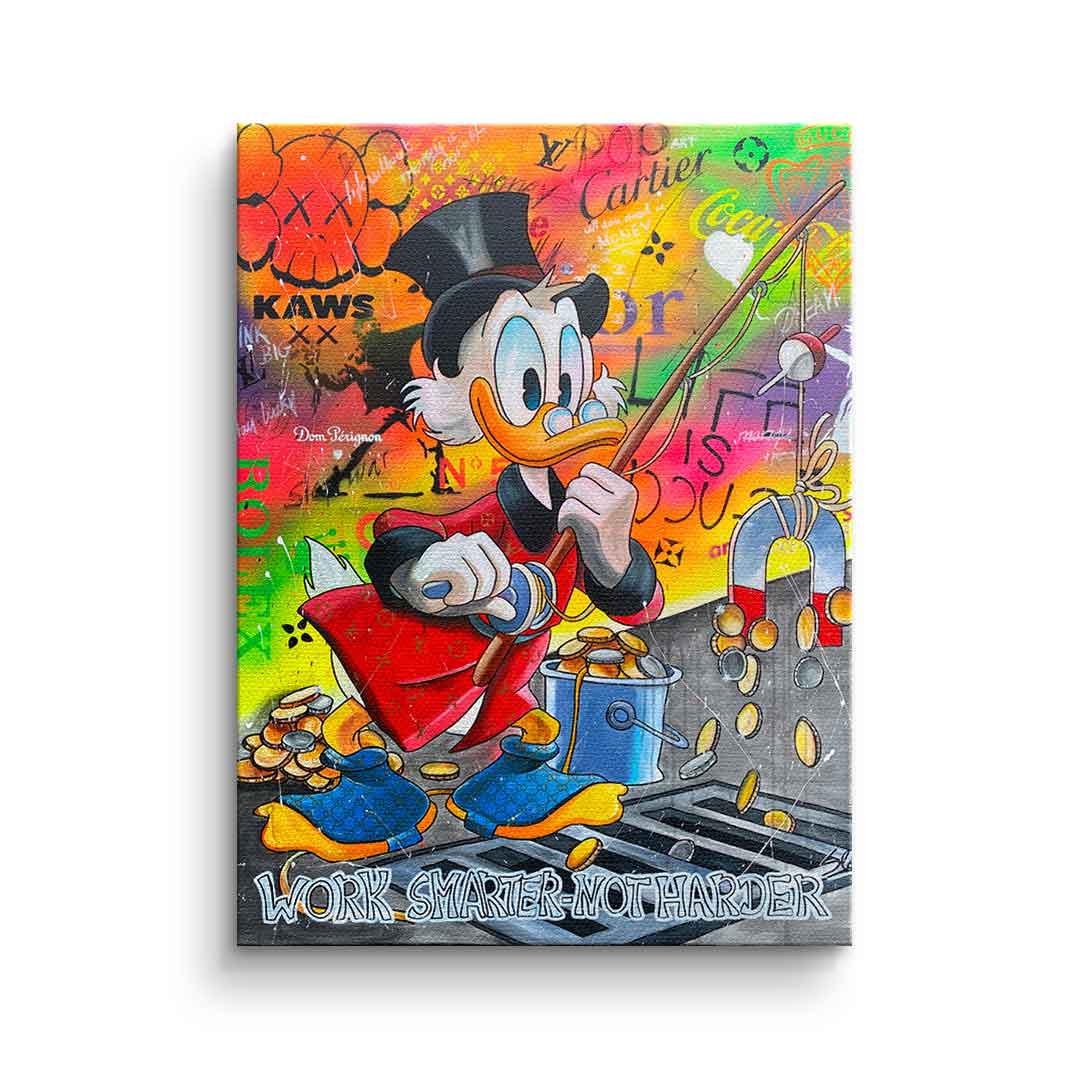 DOTCOMCANVAS® Premium Leinwandbild mit Dagobert Duck und Work Smarter not Harder - Motiv im Comic / Cartoon Stil.