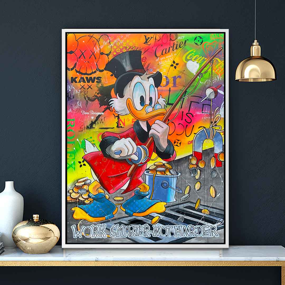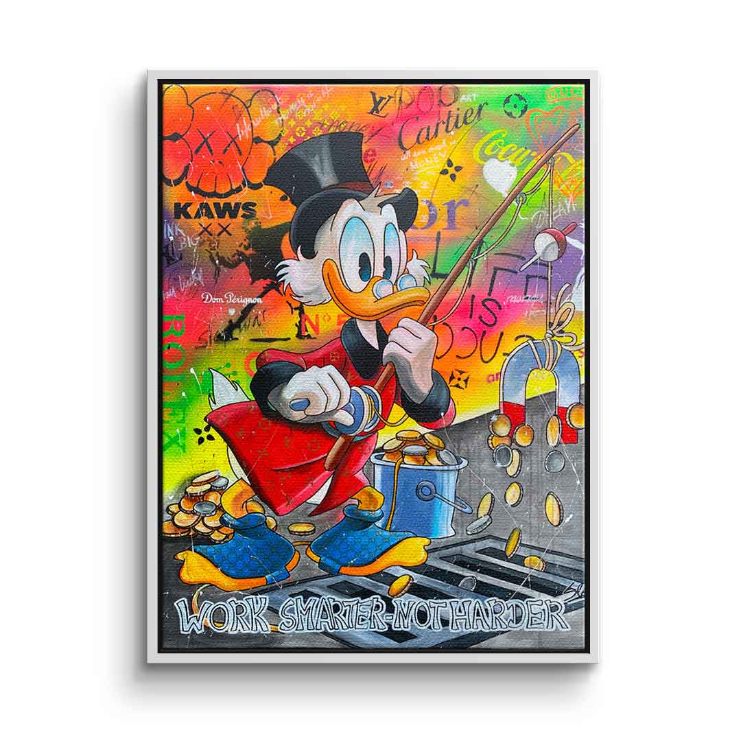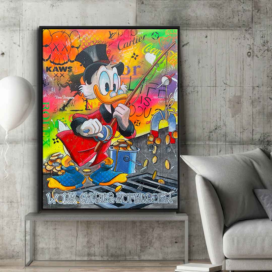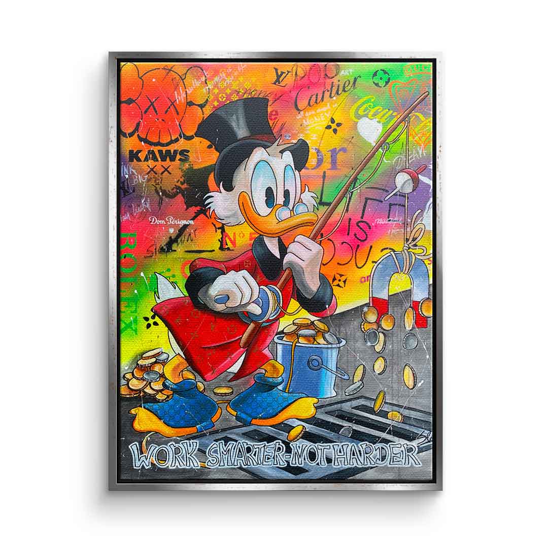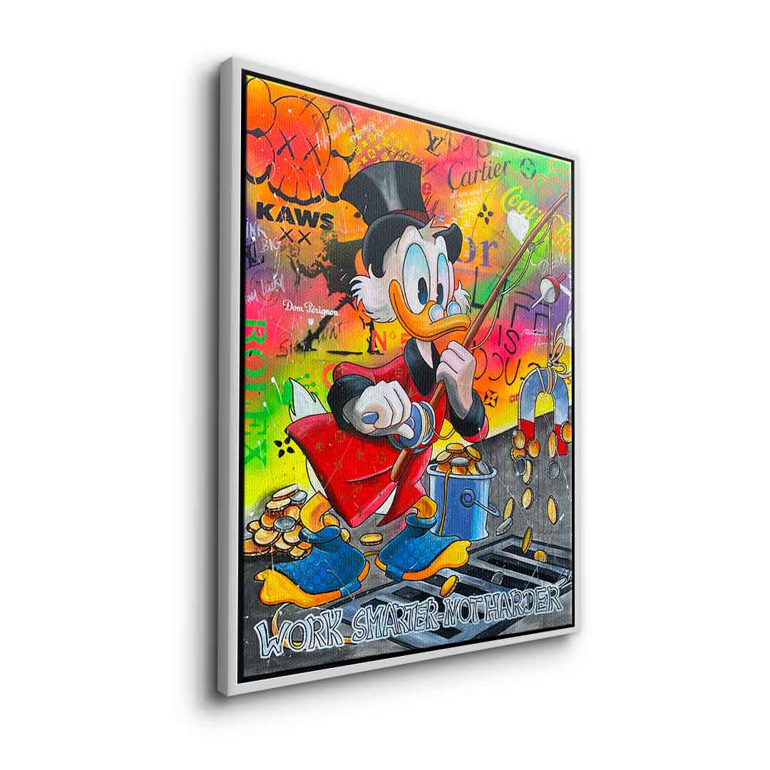 DOTCOMCANVAS® Premium Leinwandbild mit Dagobert Duck und Work Smarter not Harder - Motiv im Comic / Cartoon Stil.