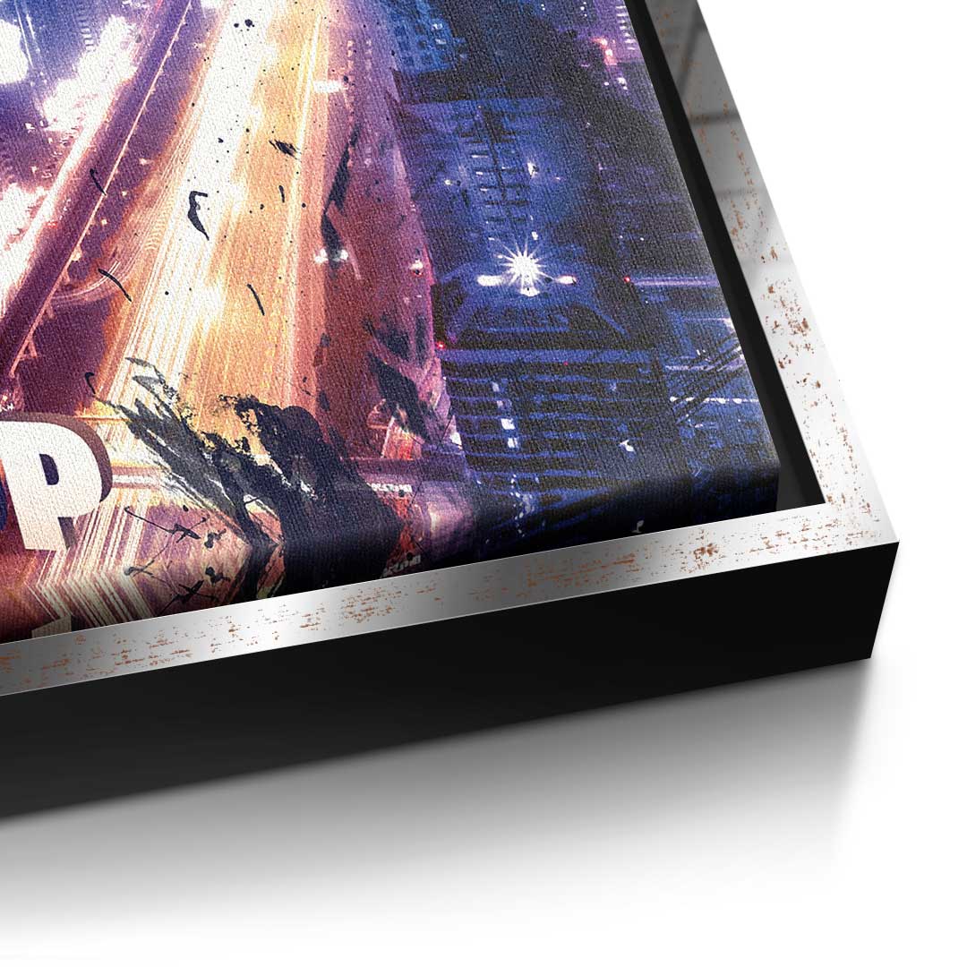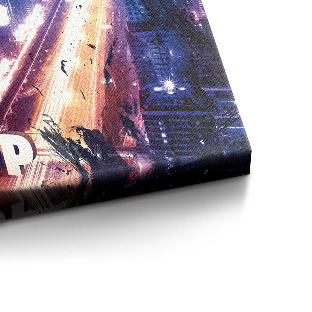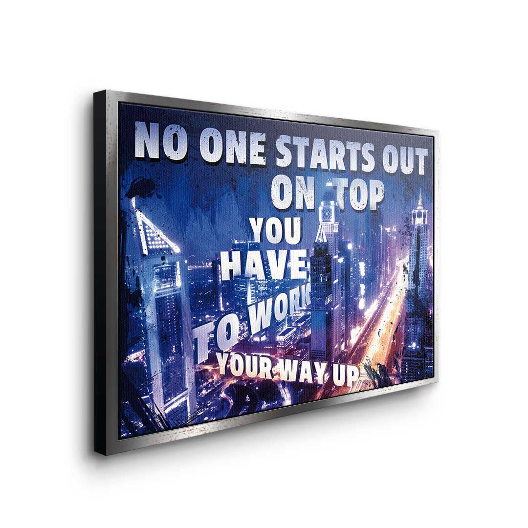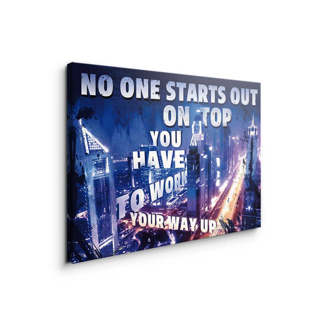 DOTCOMCANVAS® Premium Leinwandbild mit Motivationsspruch und Skyline in Blau Weiß und Schwarz.