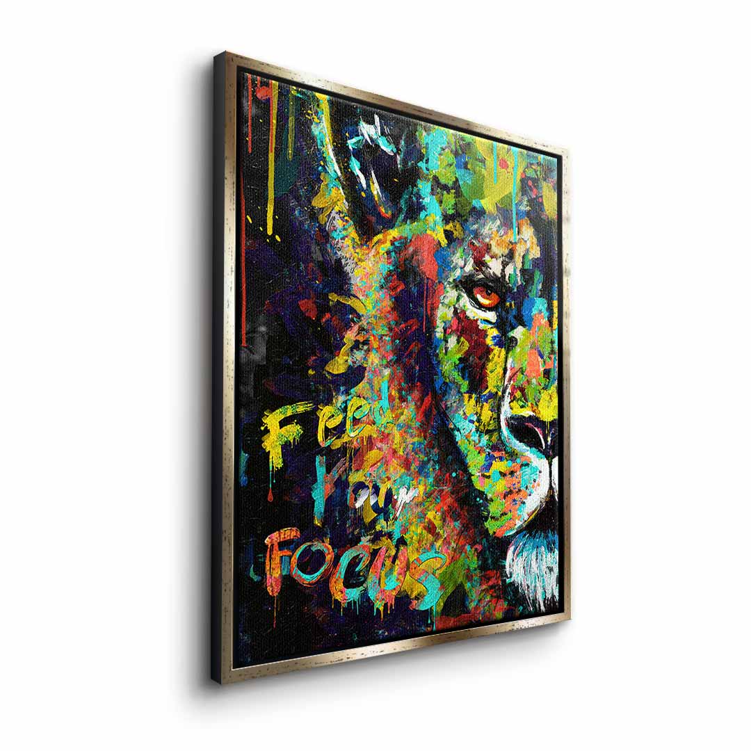 DOTCOMCANVAS® Premium Leinwandbild mit motivierendem Löwen - Motiv und Schriftzug "Feed your focus".