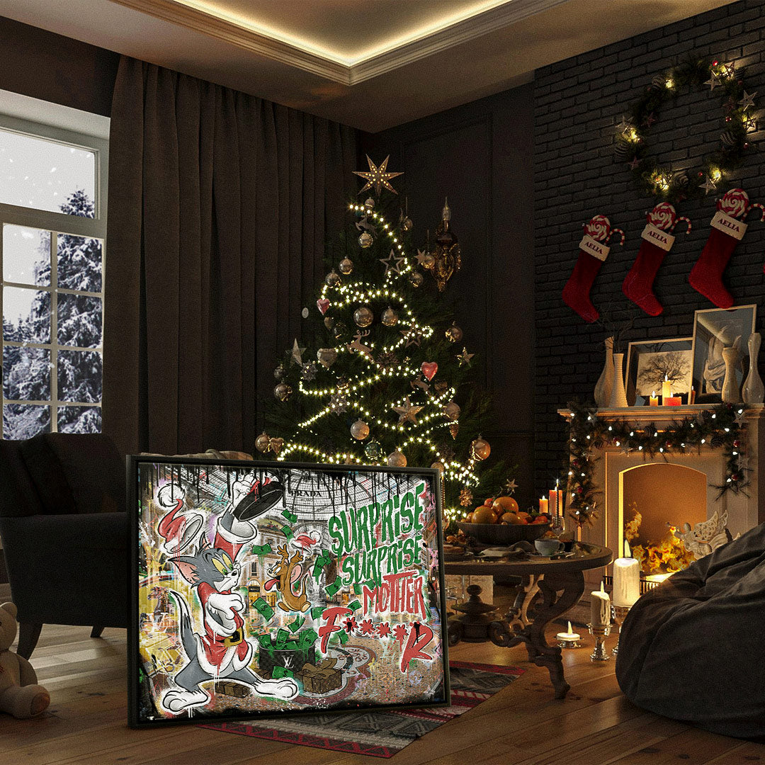The second installment of the XMAS Edition 2021, titled "Happy Surprise," is now available. The artwork is primarily distinguished by its combination of pop art elements and creative use of color. The phrase "Surprise Surprise Motherf***er" humorously illustrates the relationship between two completely different characters who, nevertheless, can't live without each other. Sometimes, real life is quite similar. The premium canvas is stretched on a high-quality, solid stretcher frame and is ready to hang.