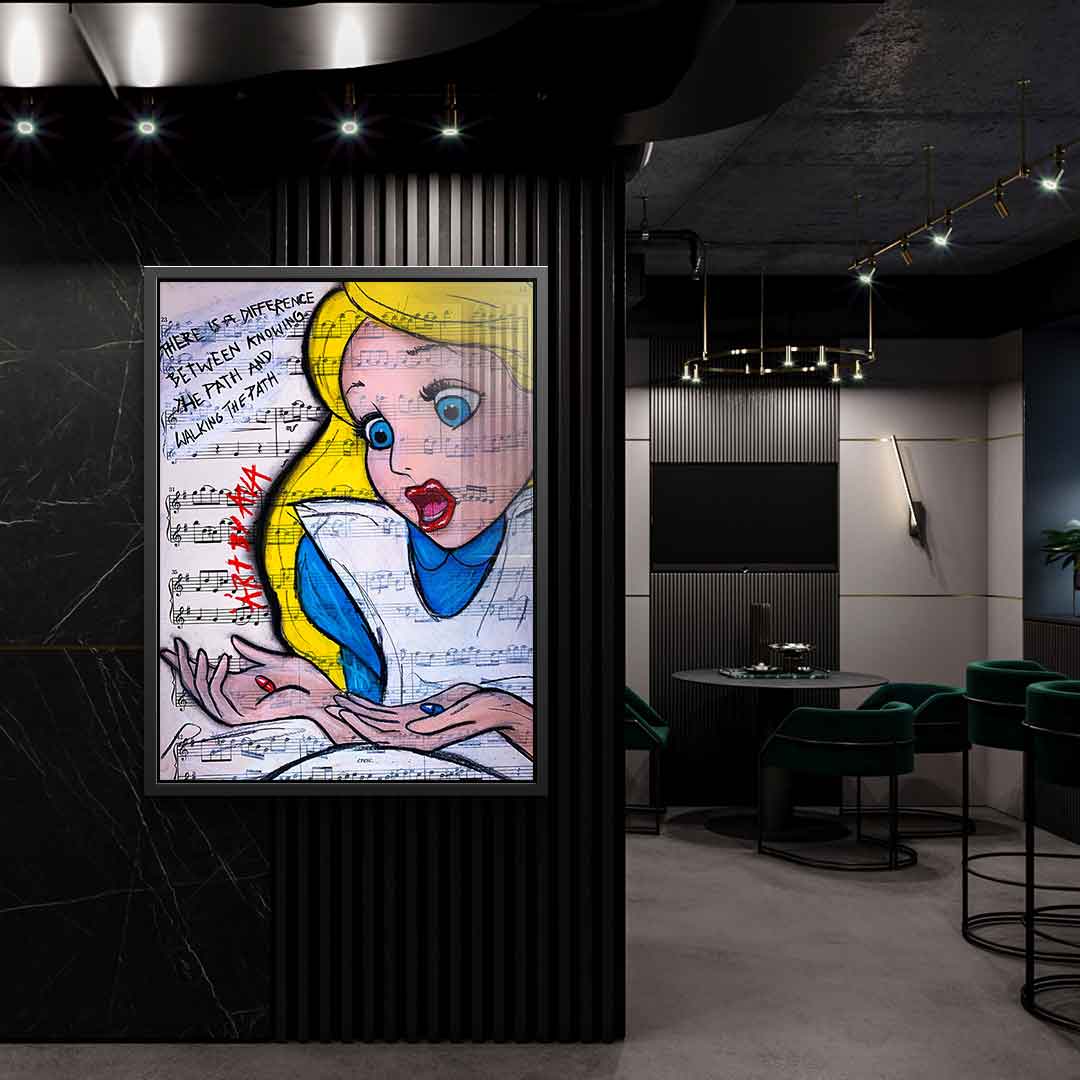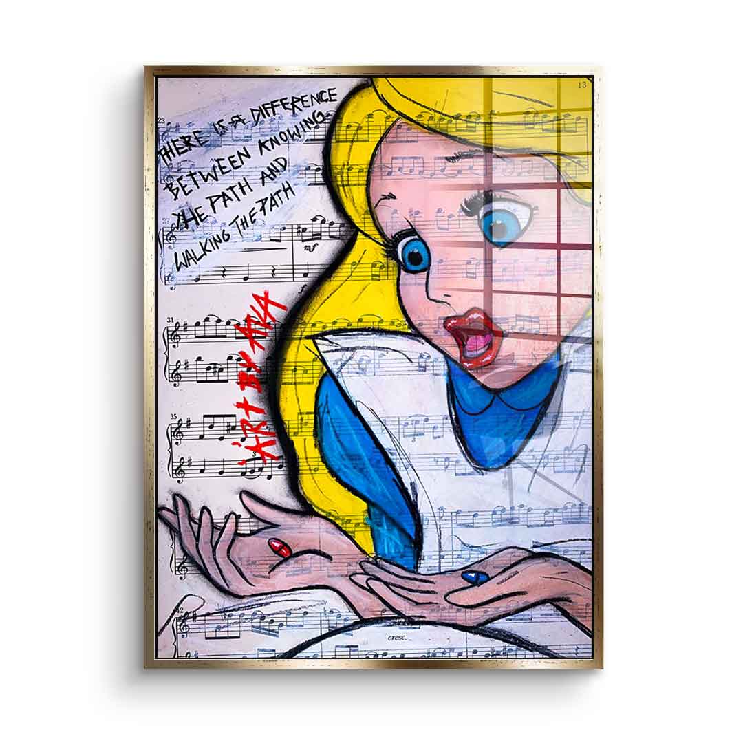 DOTCOMCANVAS® Premium Acrylic Glass Print featuring Alice in Wonderland Comic-style design.