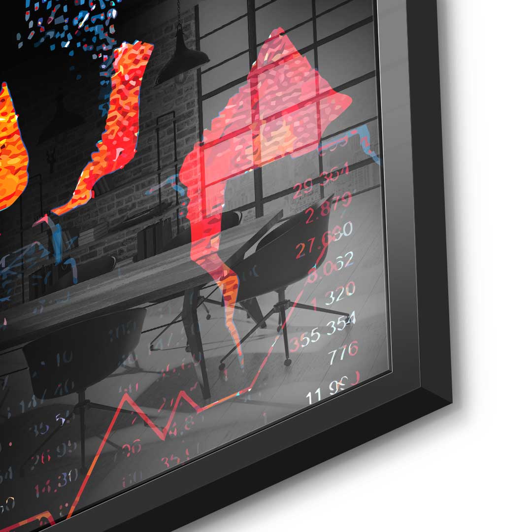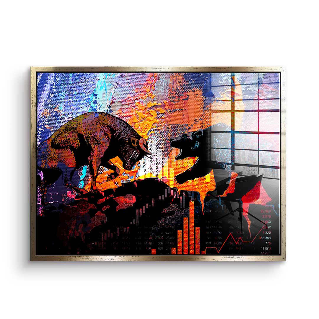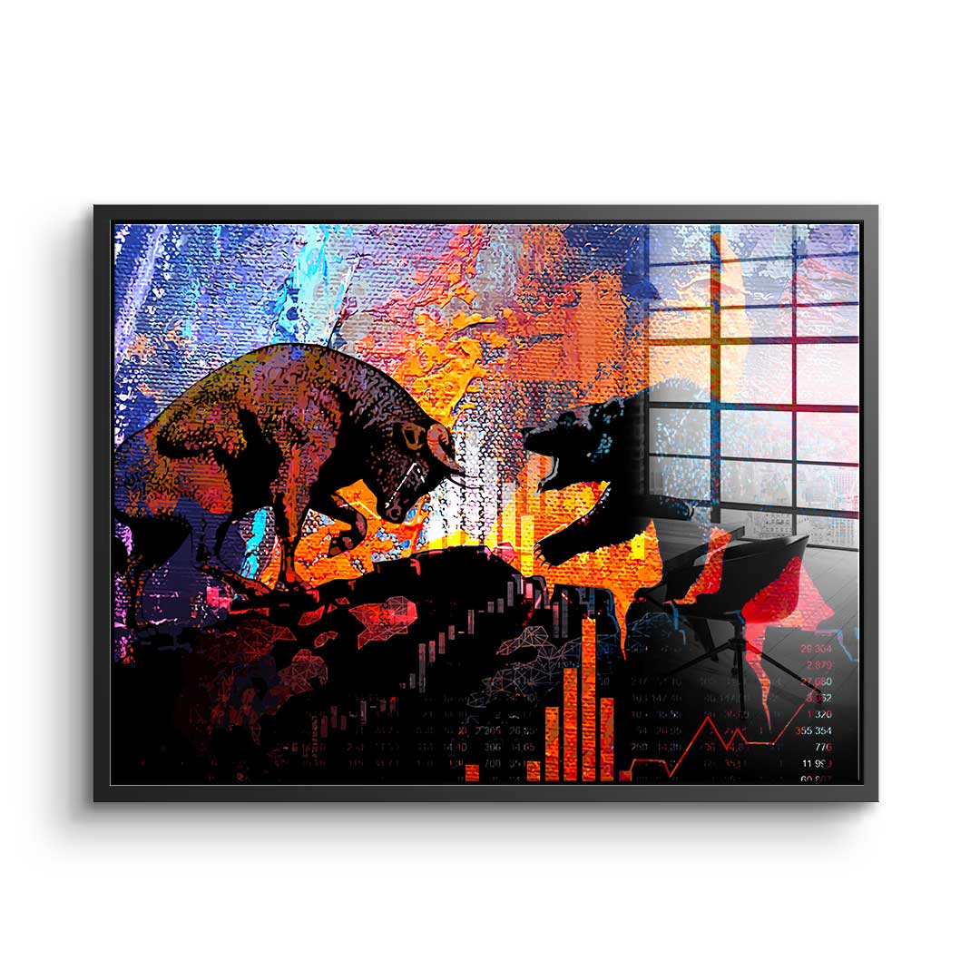 DOTCOMCANVAS® Premium Acrylic Glass Picture with Bull Fights Bear Motif.