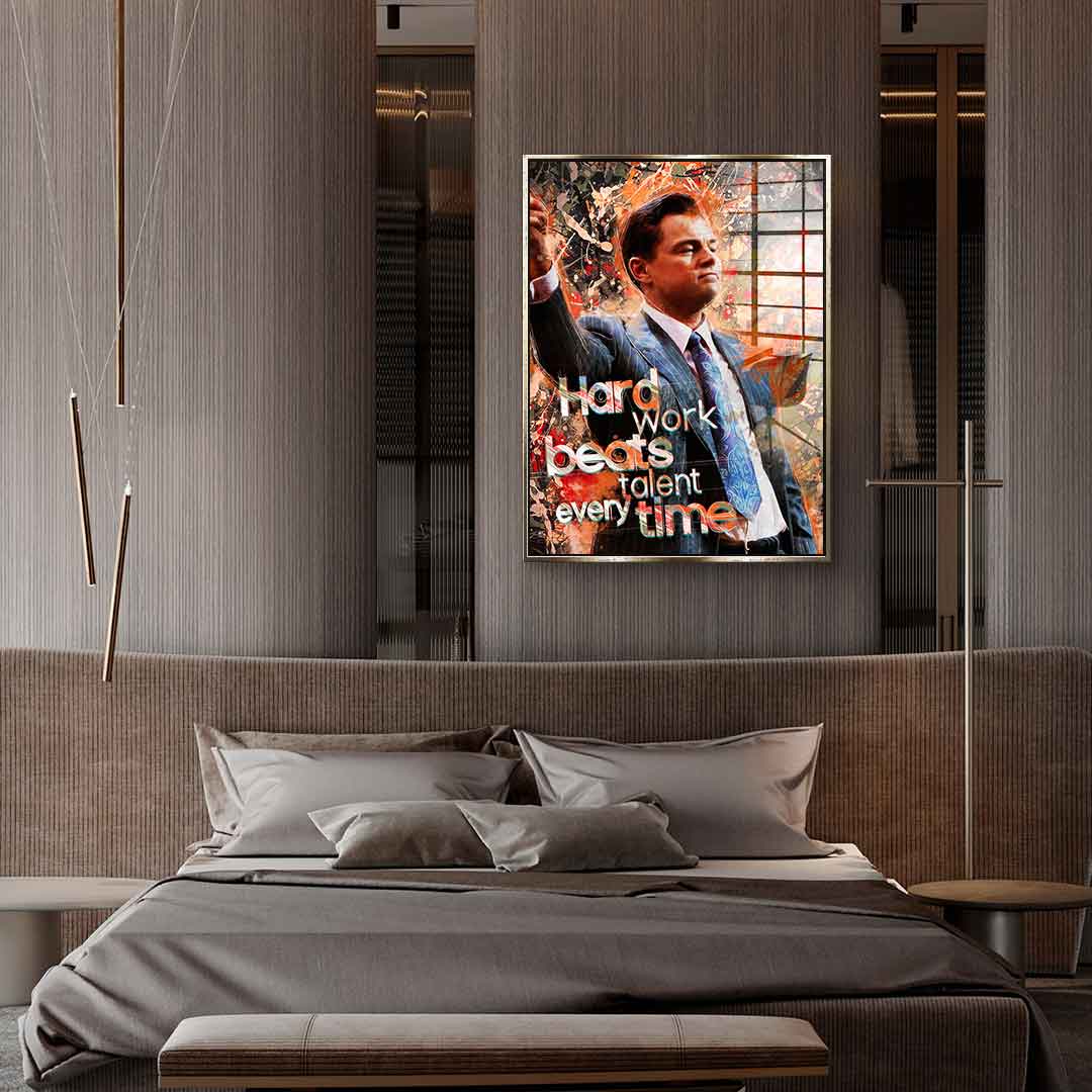 DOTCOMCANVAS® Premium Acrylic Glass Print with HARD WORK BEATS TALENT motif.