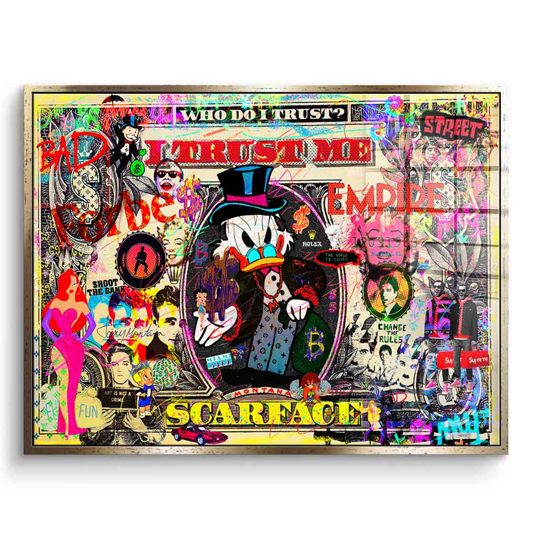 DOTCOMCANVAS® Premium acrylic glass print with I TRUST ME motif in Pop Art style.