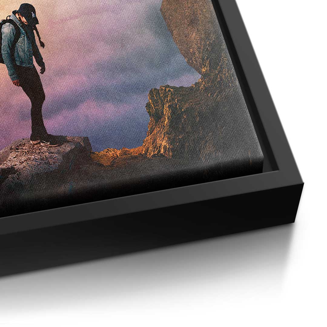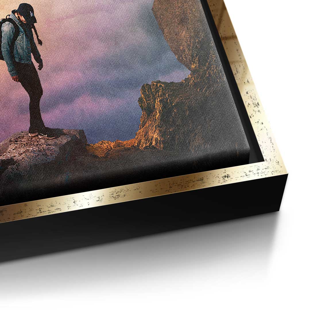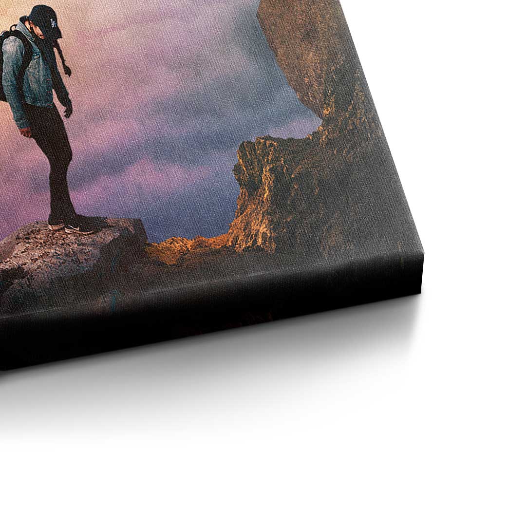 DOTCOMCANVAS® Premium canvas print with an adventurous hiking motif in the colors blue, orange and purple.