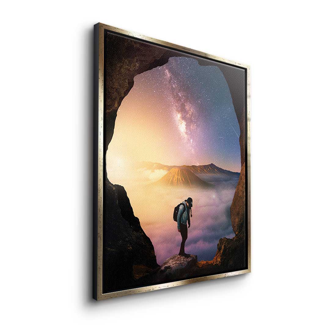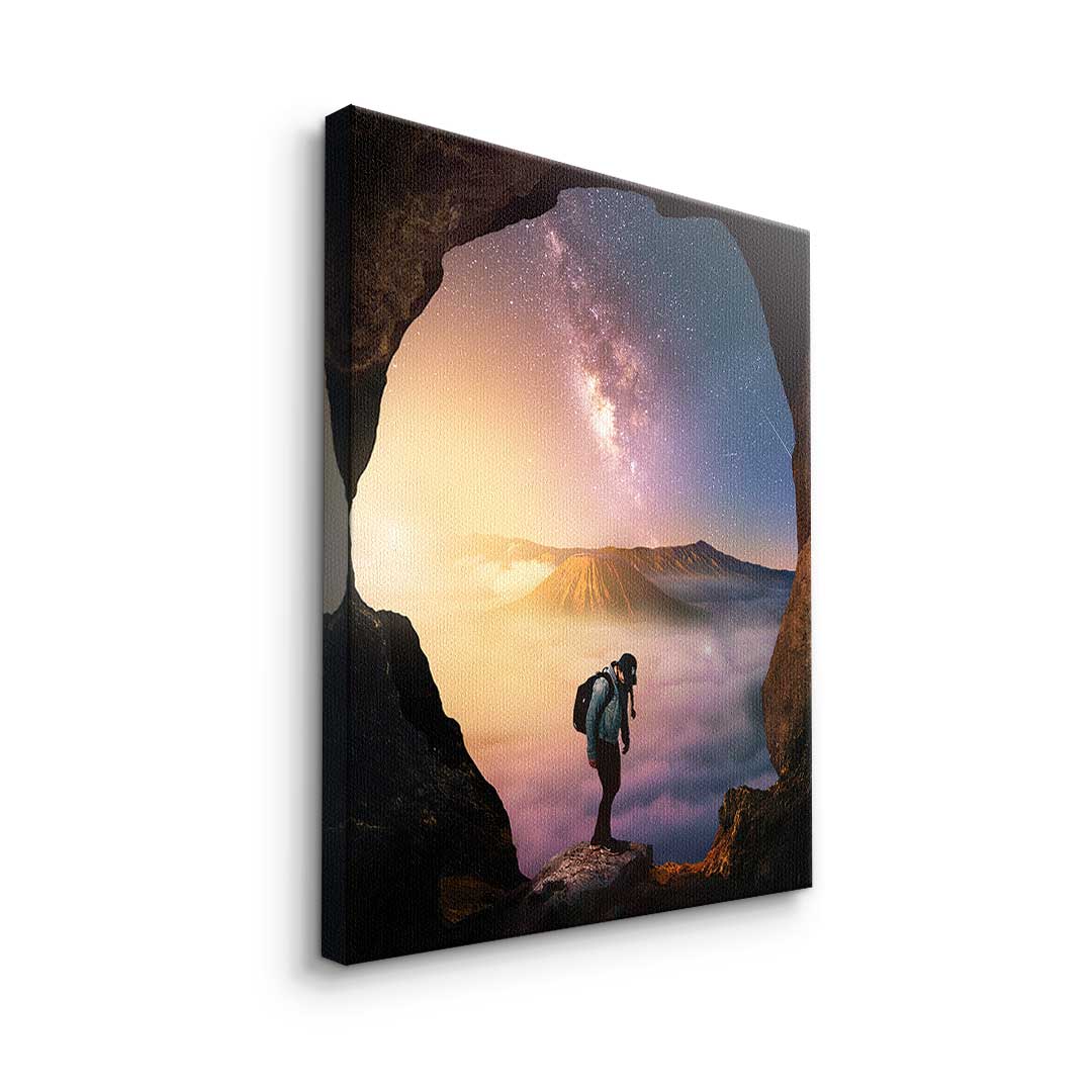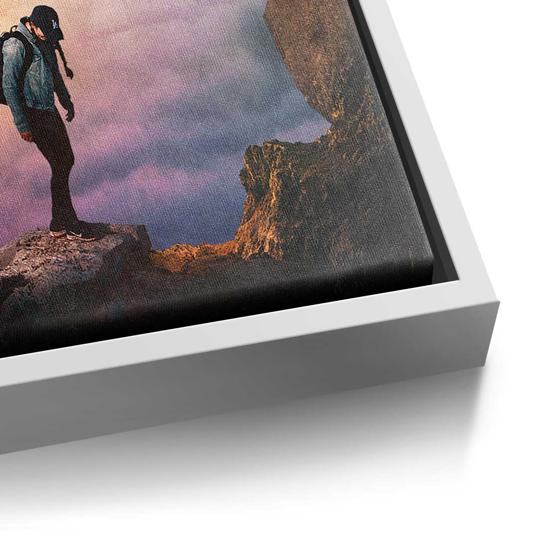 DOTCOMCANVAS® Premium canvas print with an adventurous hiking motif in the colors blue, orange and purple.