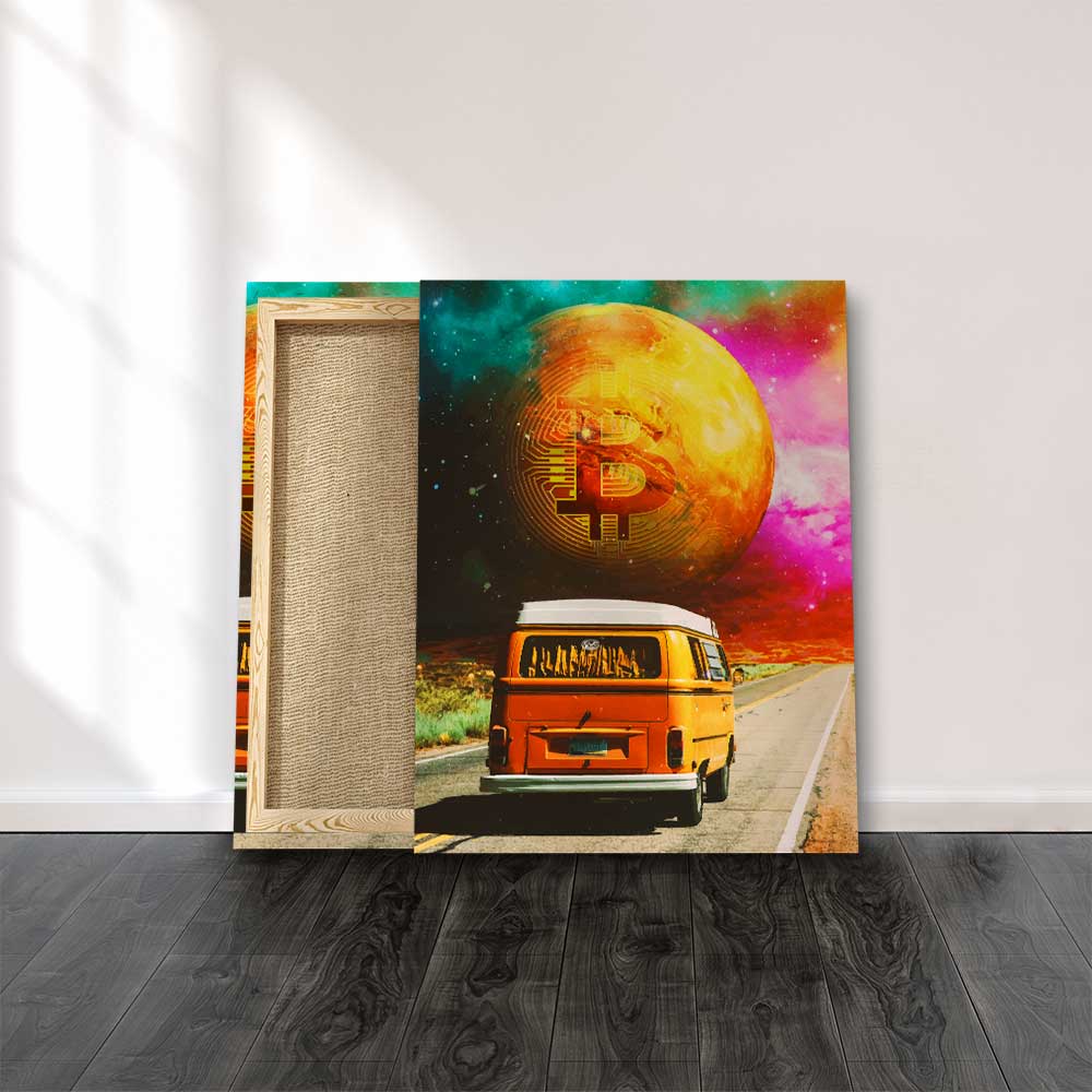 DOTCOMCANVAS® Wall Mural Bitcoin Crypto Street Travel Van Colorful Pink Gold Orange Green Black Bitcoin Roadtrip