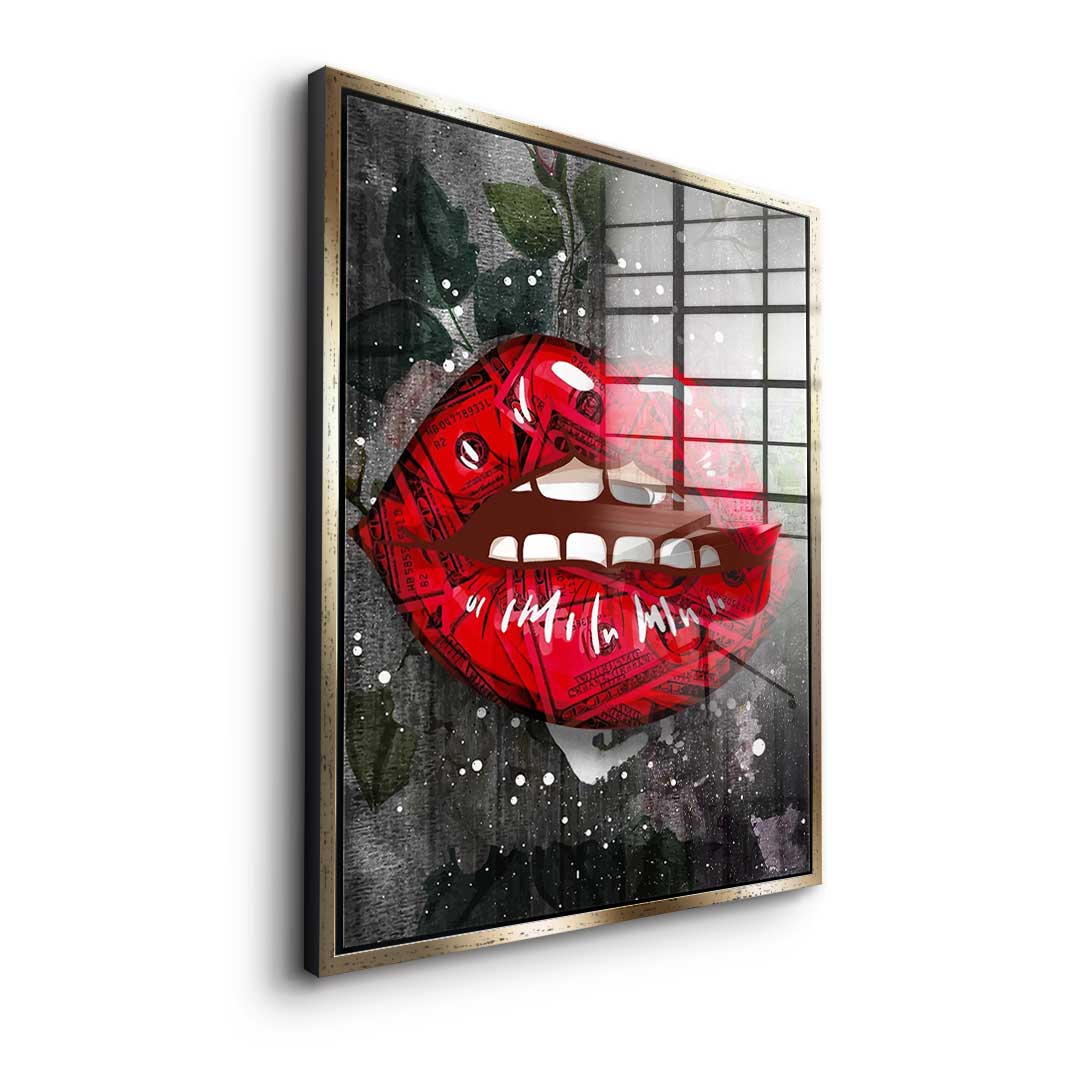 DOTCOMCANVAS® Premium Acrylic Glass Picture i Pop Art style with red lips, floral background and dollar pattern in black and red.
